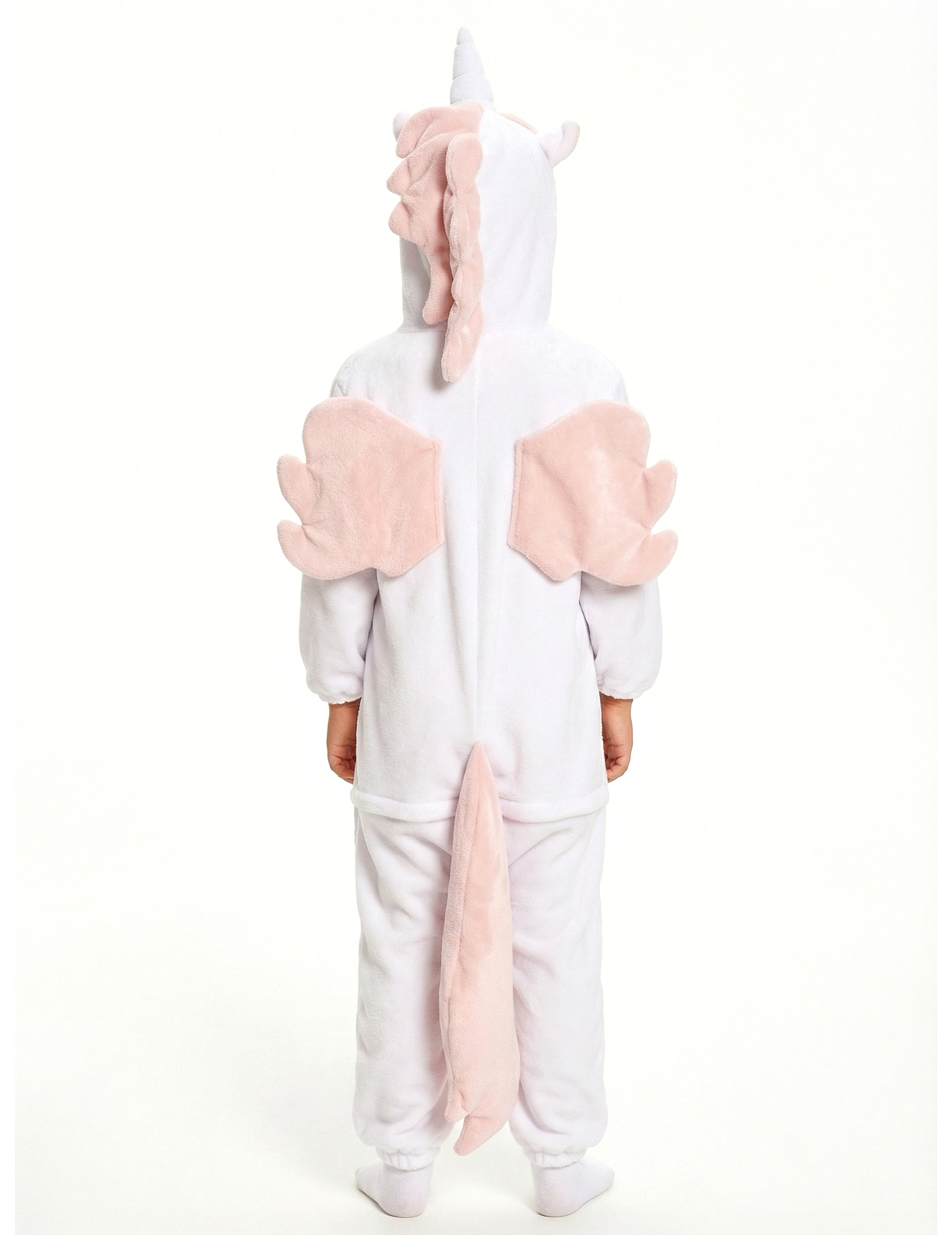Tento dětský kostým obsahuje overal. Overal je bílý s růžovým bříškem. Má kapuci, která představuje hlavu jednorožce s krásným bílým rohem a velkýma modrýma očima. Zadní část overalu zdobí růžový ocas a křídla. Zapíná se snadno na knoflíky vpředu. Bude ideální pro proměnu vašeho dítěte v jednorožce na karneval!