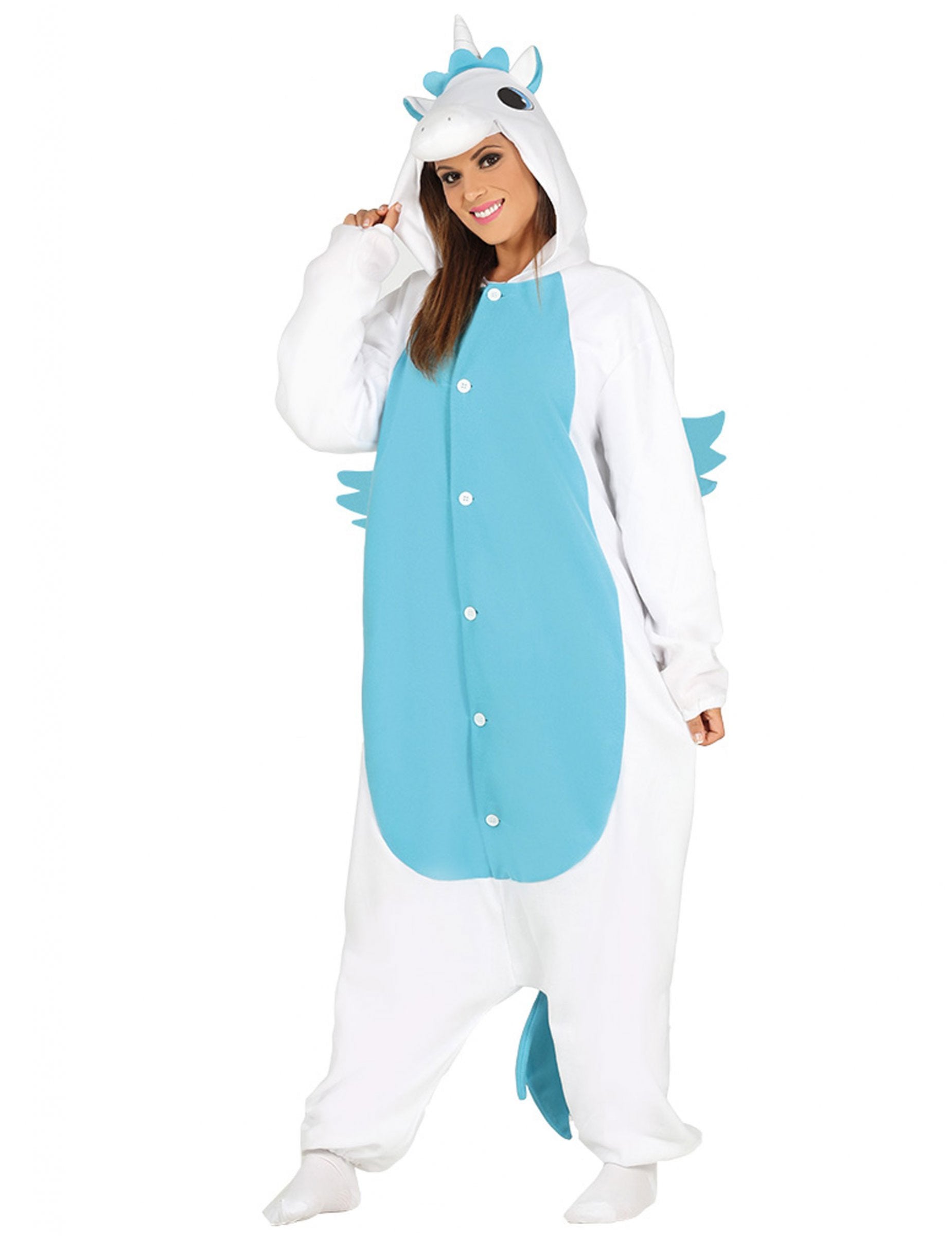 Toto převlečení jednorožce pro dospělé se skládá z velké kombinace s kapucí. Kombinace bílé barvy s modrým břichem se zavírá s knoflíky na přední straně. Dlouhý ocas s modrými vlasy. Kapota představuje hlavu jednorožce s velkými modrýma očima. Tento kostým bude ideální pro karneval.