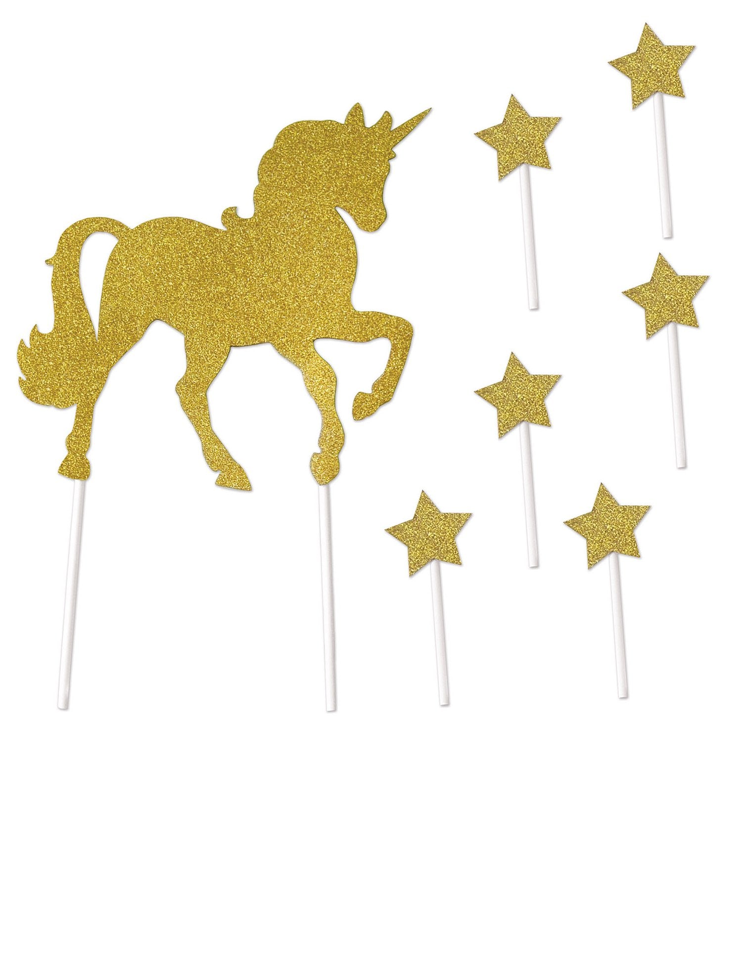 Vylepšete své cukrářské výtvory s touto sadoudortové doplňky včetně a jednorožec majestátní a 6 hvězdy šumivé. Tyto jsou vyrobeny z vysoce kvalitního zlatého kartonu ozdoby na dorty jsou upevněny na plastových hrotech pro zajištění dokonalé stability. The jednorožec zobrazuje rozměry 18 cm x 27,3 cm, zatímco malé hvězdy měří 3,8 cm x 8,9 cm. Tyto ozdoby na dorty vnese do vás magický dotek narozeninovou oslavu nebo a jednorožec miminko úspěšný.
