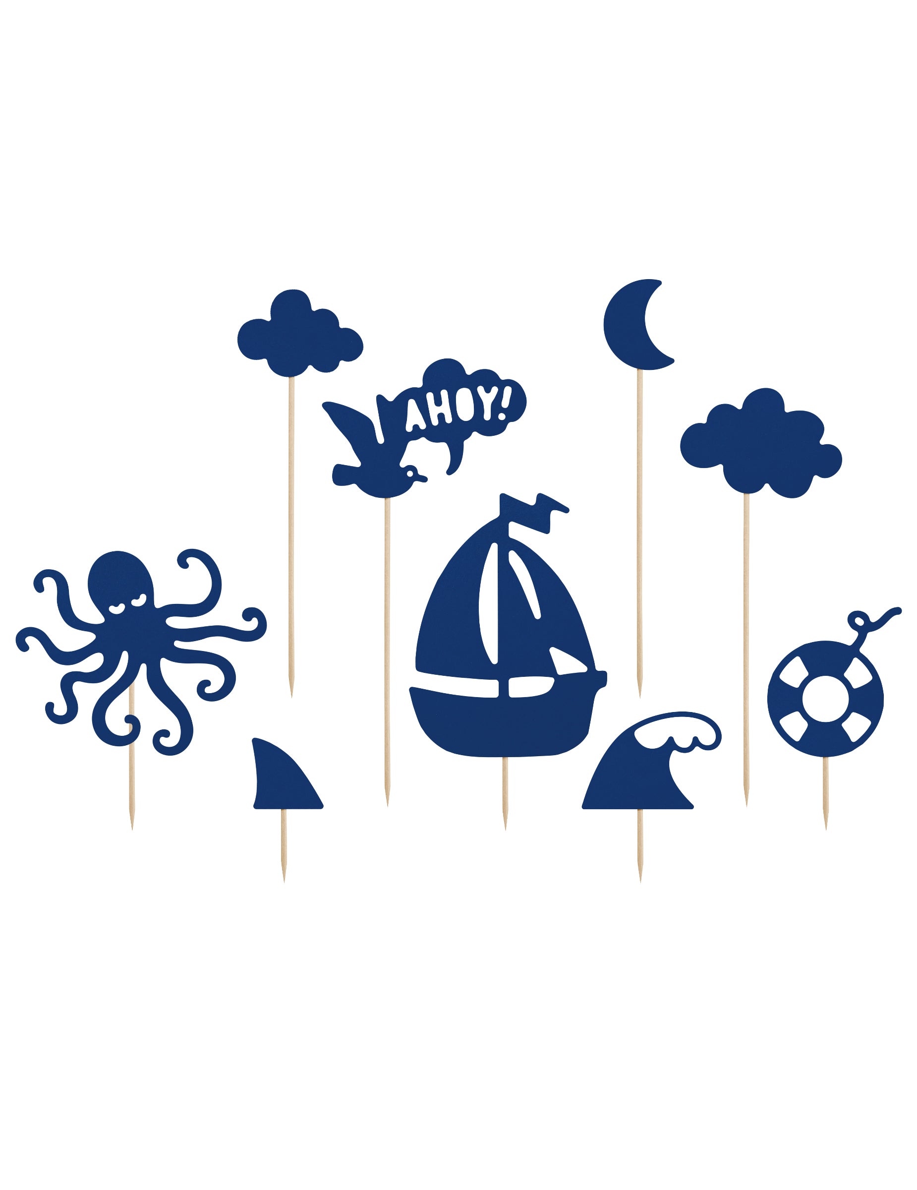 9 ozdob na dort na tmavě modré špejli 9.5 až 22.5 cm mořské vzory