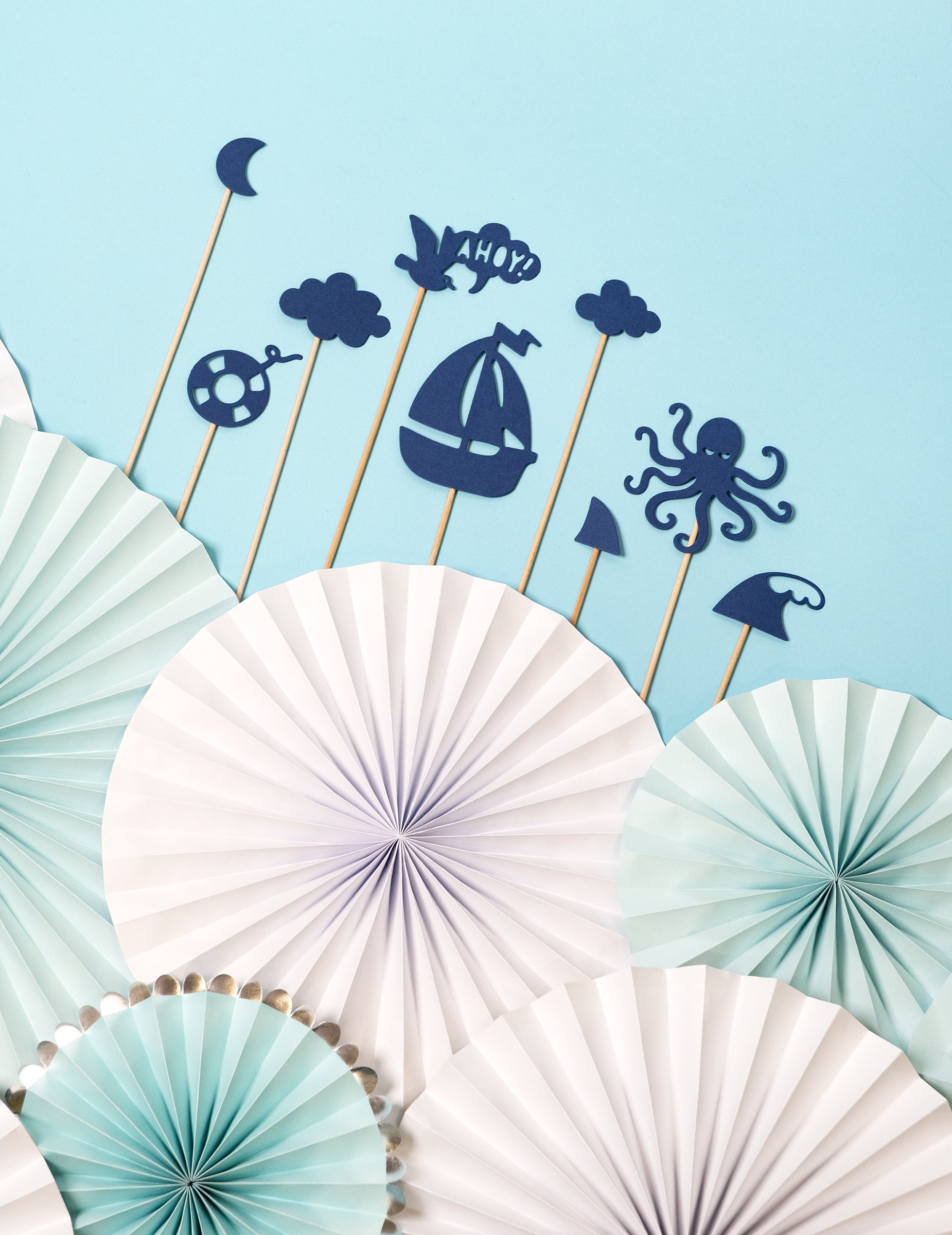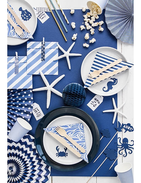Dodejte svým výtvorům nádech oceánu s touto sadou 9 kusů ozdoby na dorty namontované na tyčích. Tyto drobné příslušenství námořnická modř mají rozměry od 9,5 do 22,5 cm. Kolekce sdružuje různé ilustrované prvky jako chobotnici, člun, bójku, žraločí ploutev nebo třeba srpek měsíce. Pro personalizaci a dort na mořské téma, tyto tipy jsou ideální volbou. Skvěle se přizpůsobí během a narozeniny námořníka, z a svatba u moře nebo oslavit a chlapec miminko.