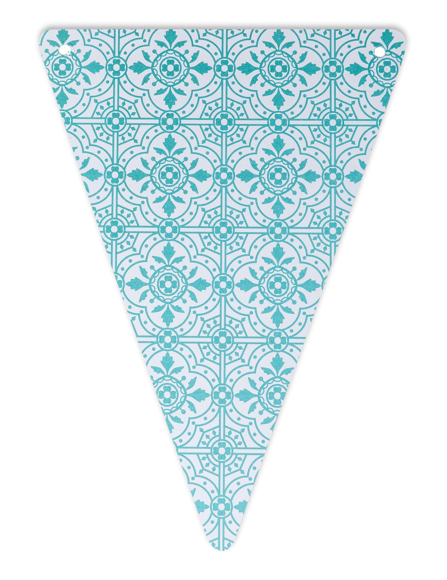 Tato partie se skládá z 5 praporky 15 x 21 kartonů cm pro vaše dekorace. Zobrazují styl cementové dlaždice ve velmi trendy bílé a tyrkysové barvě. Představte si a věnec šité na míru smícháním stylů s těmito smaragdové vlaječky z cementových dlaždic. Ideální řešení na párty s jedinečným a kreativním vzhledem.