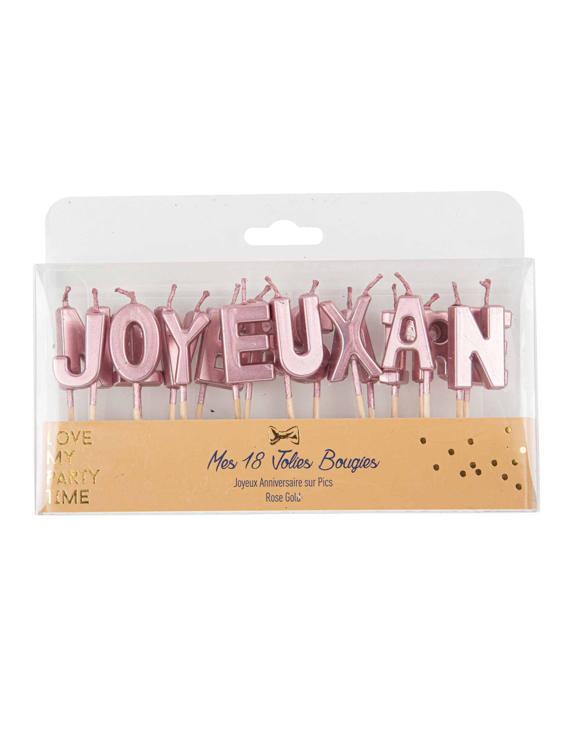Vneste na svůj večírek jiskru s touto sadou narozeninové svíčky rafinované. Tato sada obsahuje 18 písmen připevněných k plastovým trsátkům pro snadné vkládání do vašeho narozeninový dort. Shromáždění tvoří zprávu „ Všechno nejlepší k narozeninám » s velmi trendy metalickým růžovým zlatem. Každý kus měří přibližně 4,3 cm vysoká. Tyto svíčky jsou ideálním doplňkem pro vylepšení narozeninový dort mladé dívky během růžové zlaté tématické události.