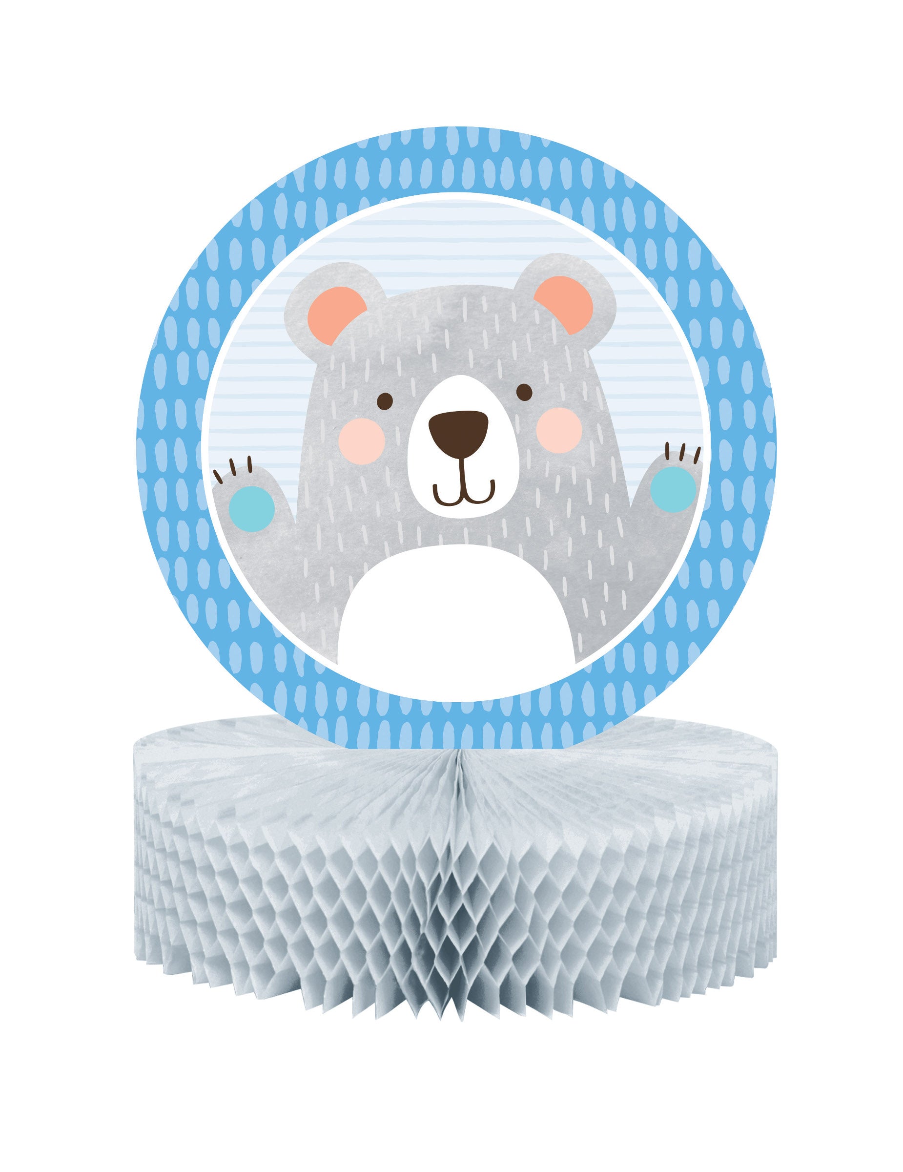 Vylepšete svou akci tímto středobodem 30,5 x 22,8 cm z voštinového papíru. Sportuje tendr malý medvěd šedá uprostřed modrého kruhu. Toto dekorace na stůl je ideální pro pořádání a miminko nebo oslavit první narozeniny vašeho dítěte.