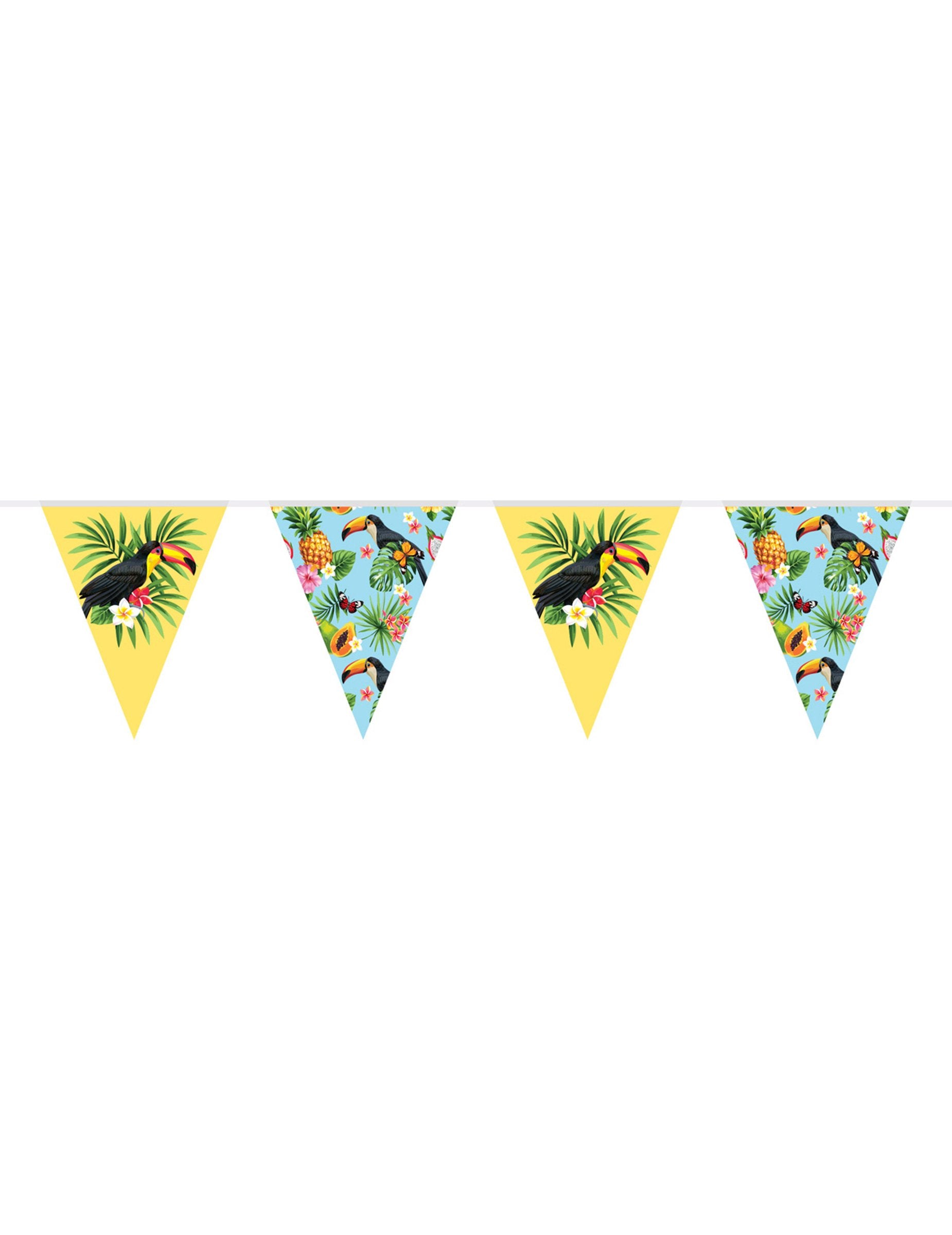 Dodejte své akci barevný nádech s tímto tukanová girlanda vyrobeno z odolného plastu. S celkovou délkou 10 metrů představuje střídání žlutých vlajek s velkým tukan v srdci džungle a tyrkysové vlaječky ilustrované tropické květiny aananas sladké. Toto tropický věnec je nezbytným doplňkem pro venkovní nebo vnitřní párty dekorace, perfektně zapadne do a tropické téma nebo exotické.