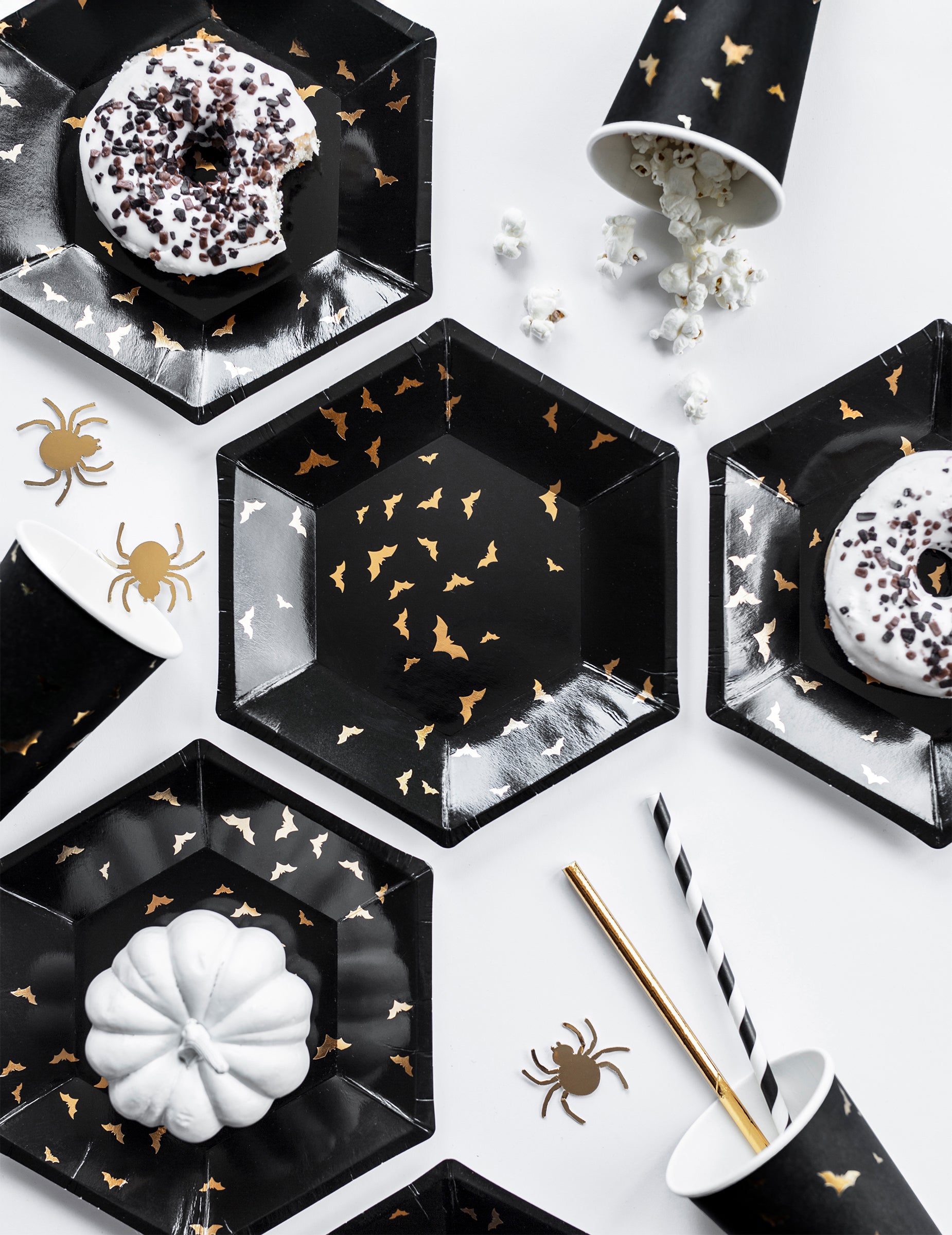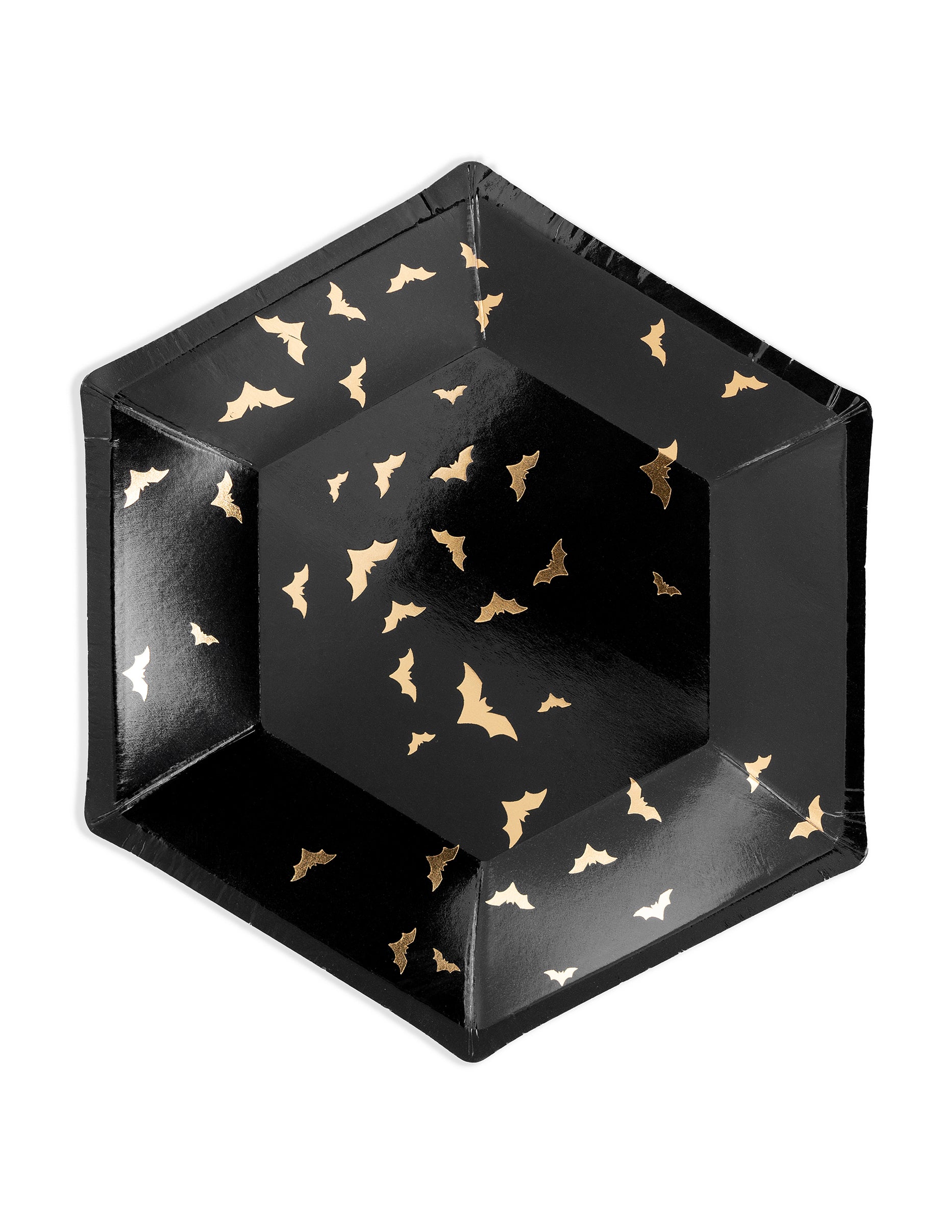 6 papírových talířů černé a zlaté netopýry 20 cm šestiúhelníkový