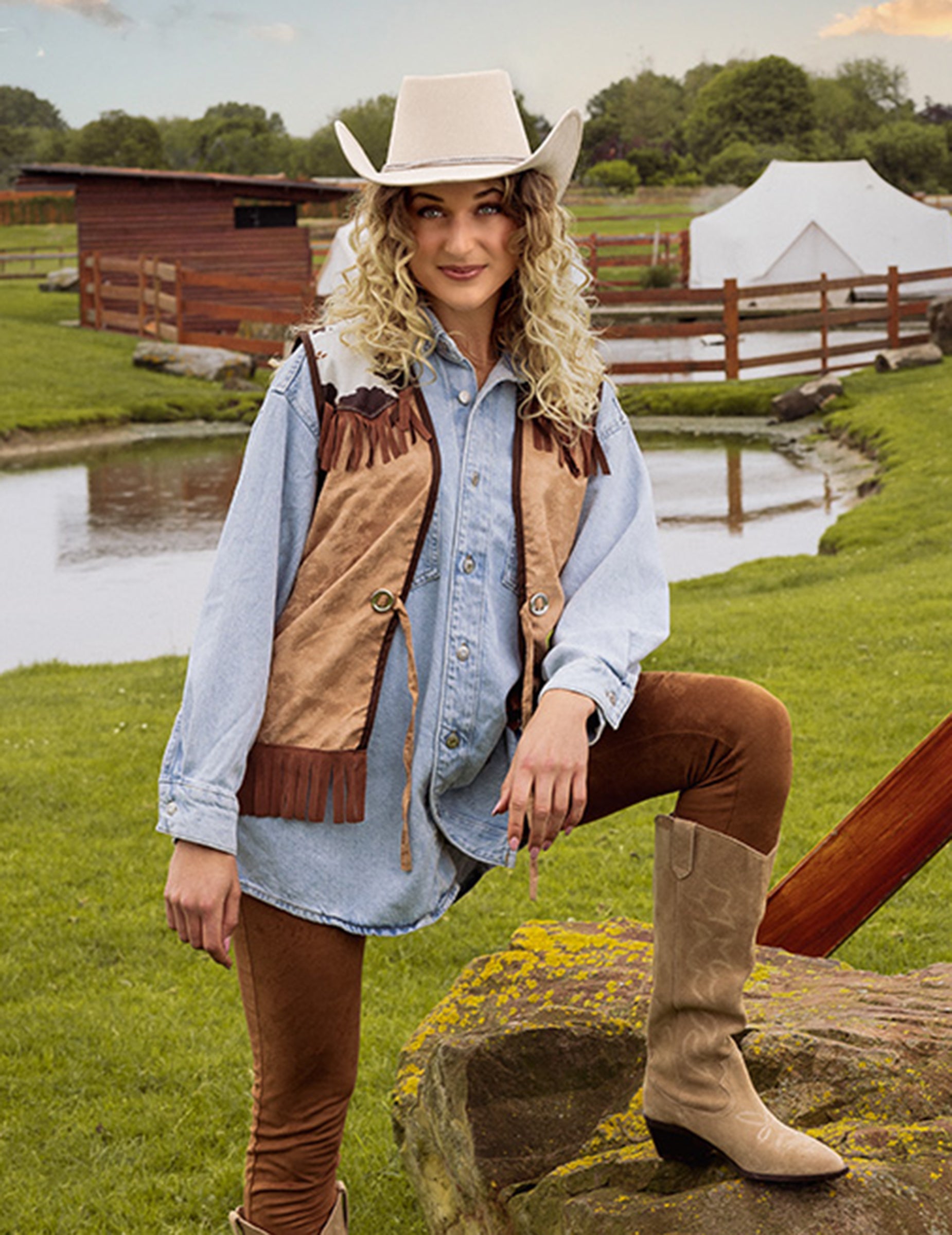 Tento kovbojský klobouk je určen pro dospělé. Má béžovou barvu s bílým provazem s kovovými konci. Napodobuje klobouky, které nosí kovbojové. Bude se perfektně hodit jako kostým na indiánskou a kovbojskou párty!