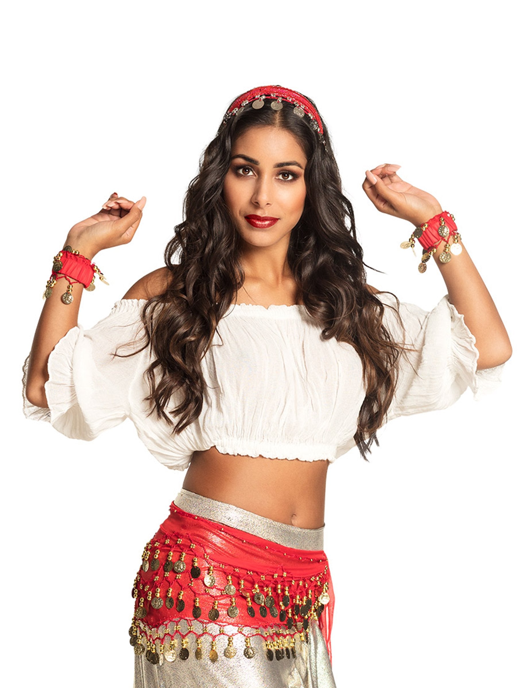 Tato cikánská sada pro ženy se skládá z čelenky, náramků a pásku (top a sukně nejsou součástí balení). Doplňky, které tvoří tuto sadu, jsou vyrobeny z červené látky s malými zlatými detaily. Bude perfektním doplňkem k vašemu cikánskému kostýmu na karneval.