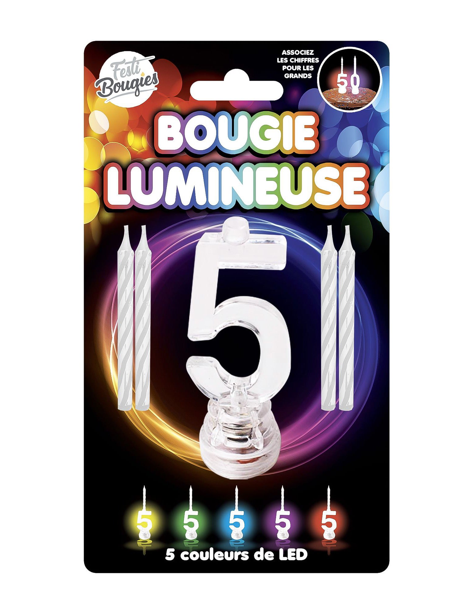Tato šarže obsahuje světelnou podporu a 4 voskové svíčky. Průhledná podpora plastu představuje číslo 5, rozsvítí se s 5 různými barvami: žlutá, zelená, růžová, červená a modrá. 4 klasické bílé svíčky s bílou barvou budou umístěny na světelné základně. Tyto lehké svíčky přinesou originální dotek na váš narozeninový dort!