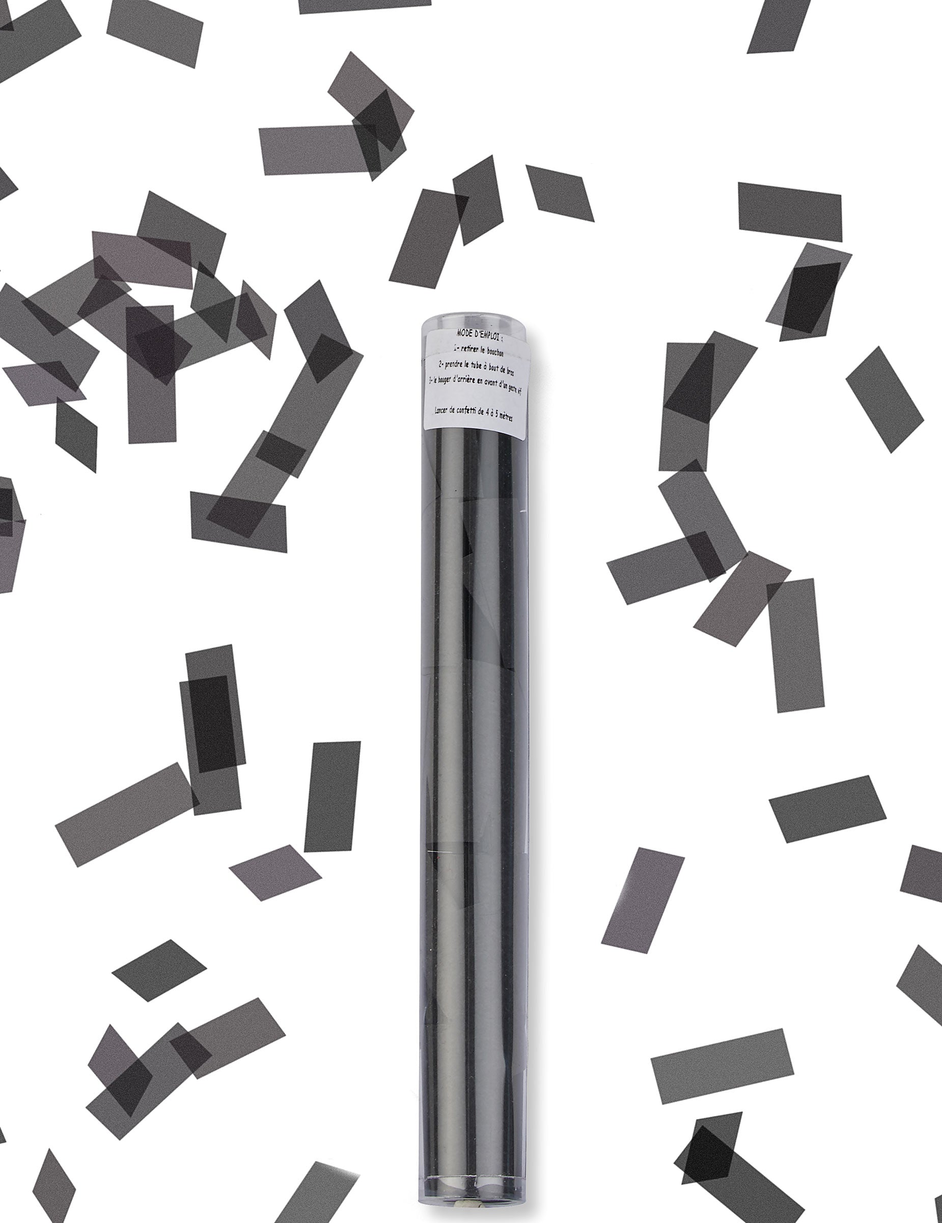 Toto konfety je vyrobeno z lepenky. Musíte jen odstranit víčko, vzít trubici na délku paže a přesunout ji zepředu do živého gesta. Hlaveň poté spustí konfety černého obdélníku po dobu 4 až 5 metrů. Tato hlaveň bude ideální například pro oslavu narozenin!