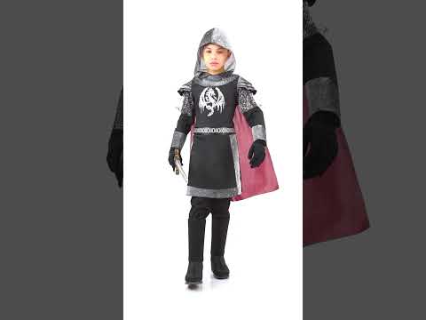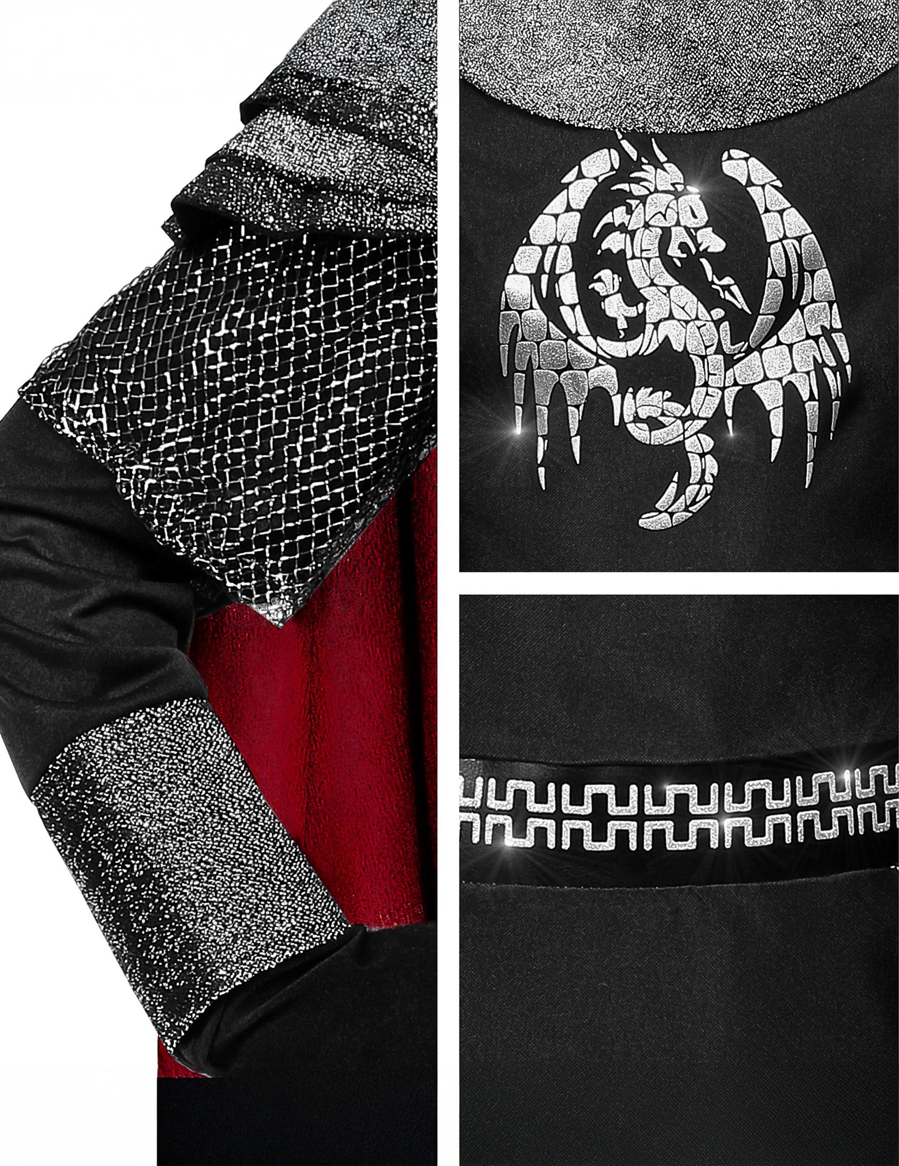 Tento dětský kostým dračího rytíře se skládá z tuniky s pláštěm a kapucí (rukavice, návleky na boty a kalhoty nejsou součástí balení). Tunika je černá s vsadkami ve stylu kroužkové zbroje na spodní části, zápěstích a ramenou. V pase je potisk falešného černo-stříbrného opasku. Na trupu je nakonec všitý stříbrný drak. K tunice je přišita kapuce podobná kroužkové zbroji a červený plášť na vnitřní straně. Váš syn bude v den maškarních narozenin nebo karnevalu tím nejkrásnějším středověkým rytířem.