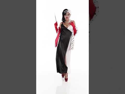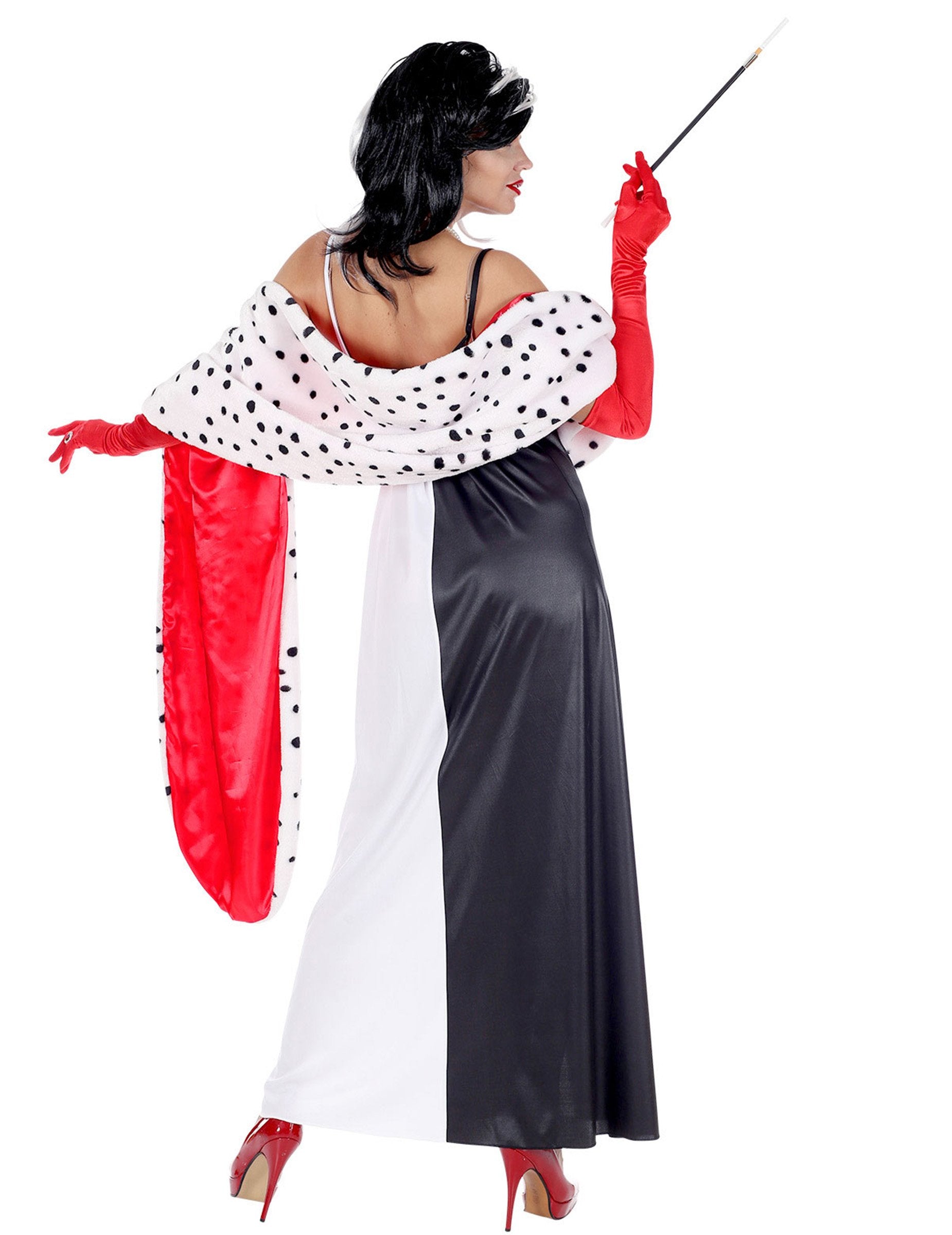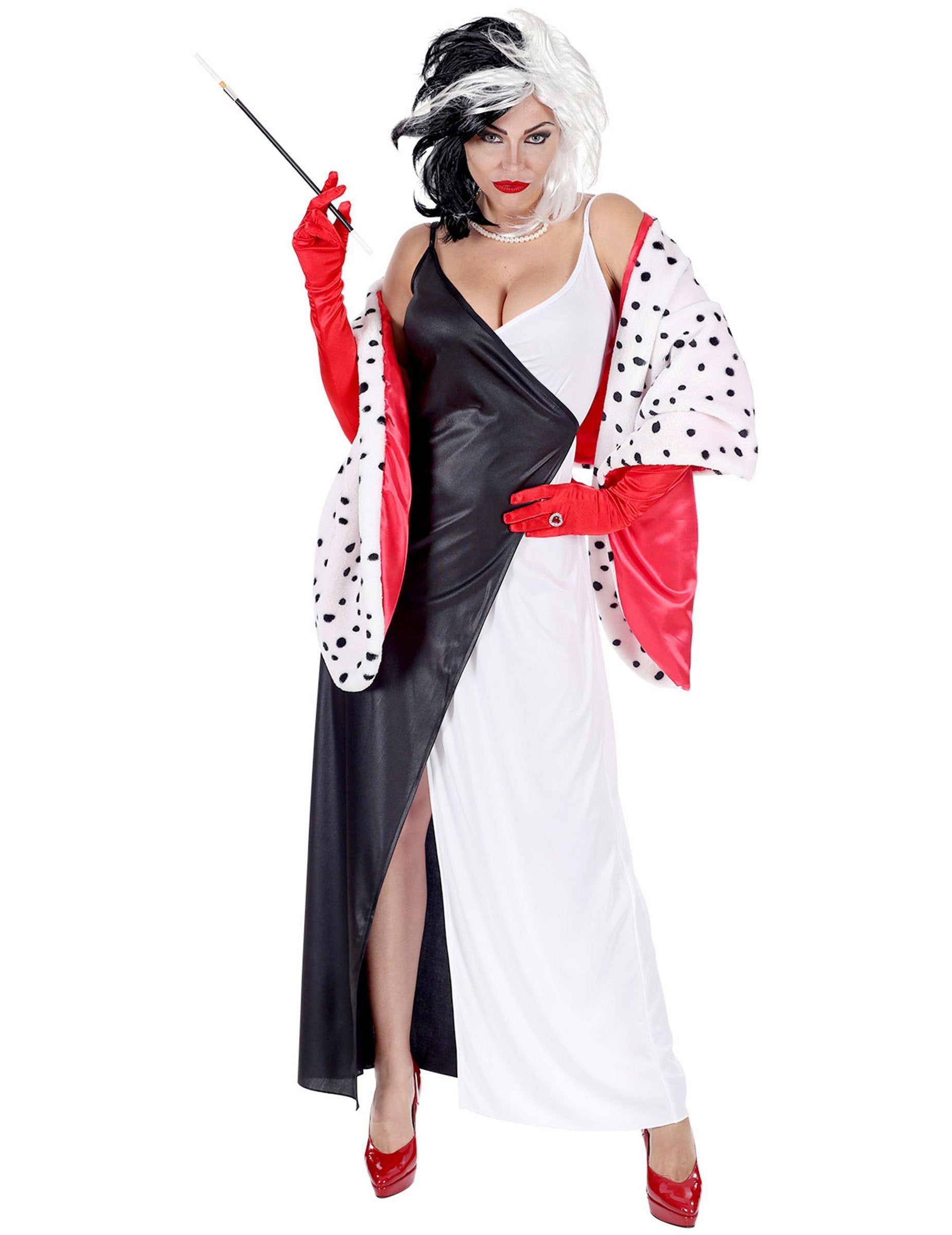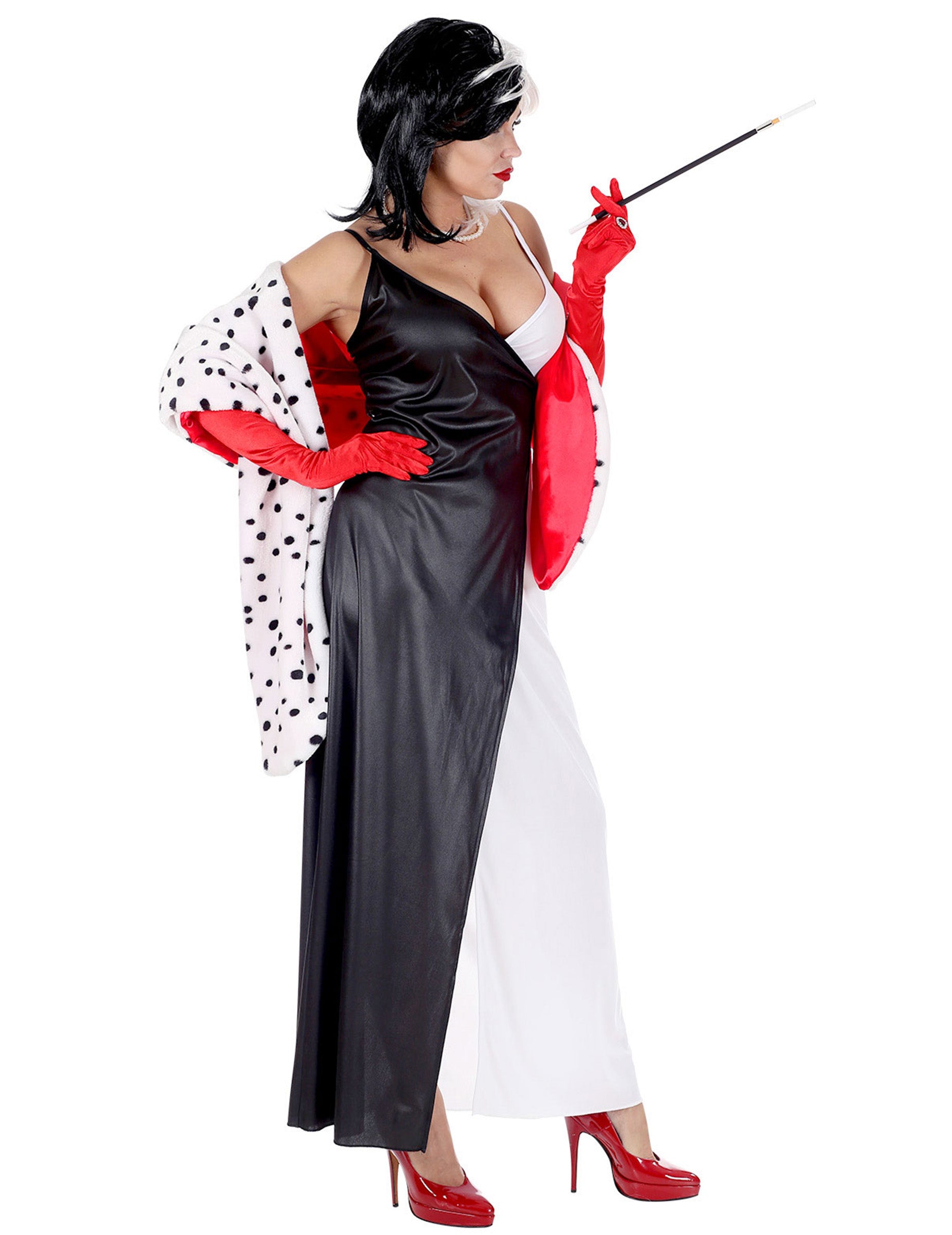 S černobílou dvoubarevnou parukou k tomuto dámskému démonickému kostýmu budete vypadat jako slavná zlá kreslená lovkyně dalmatinů ...