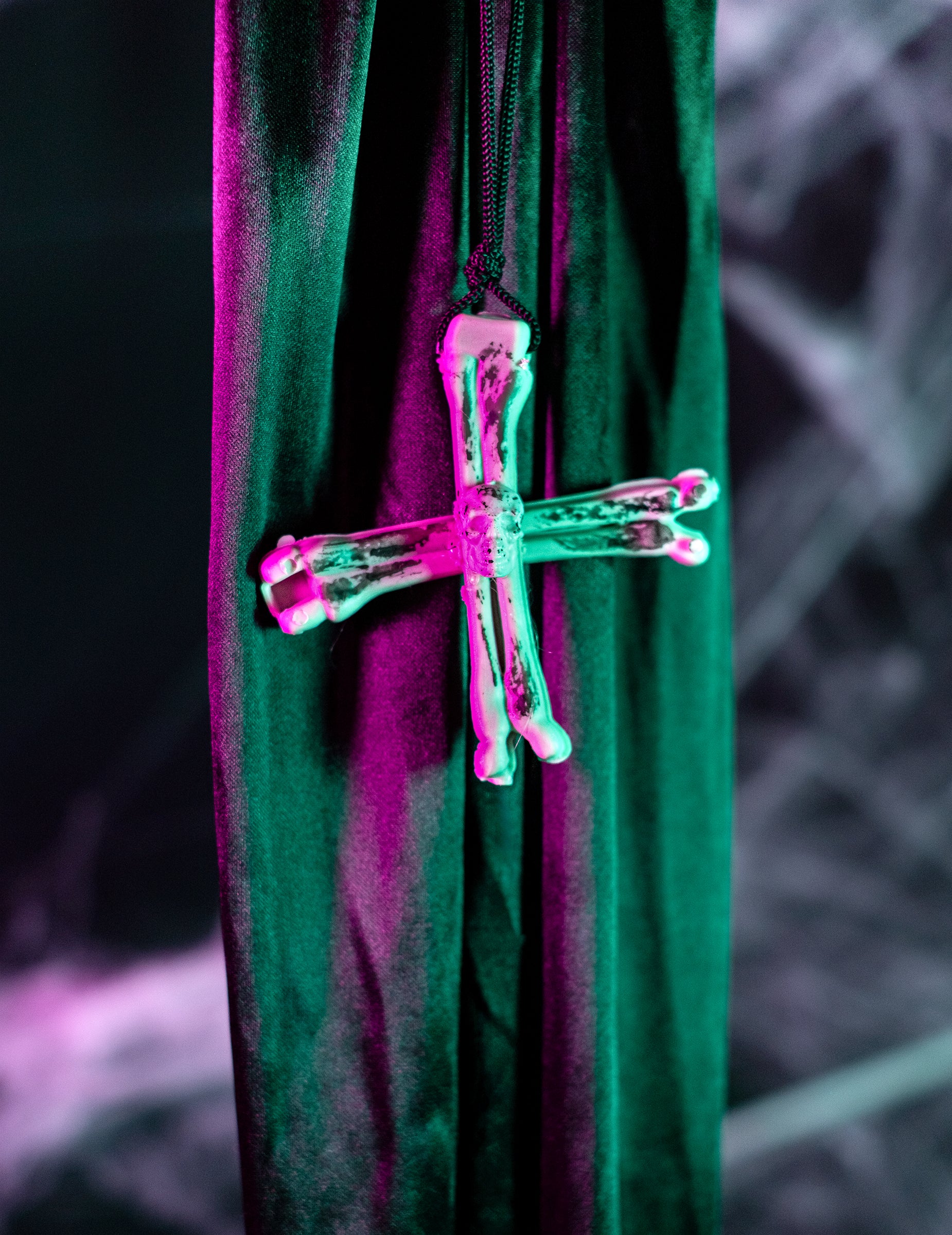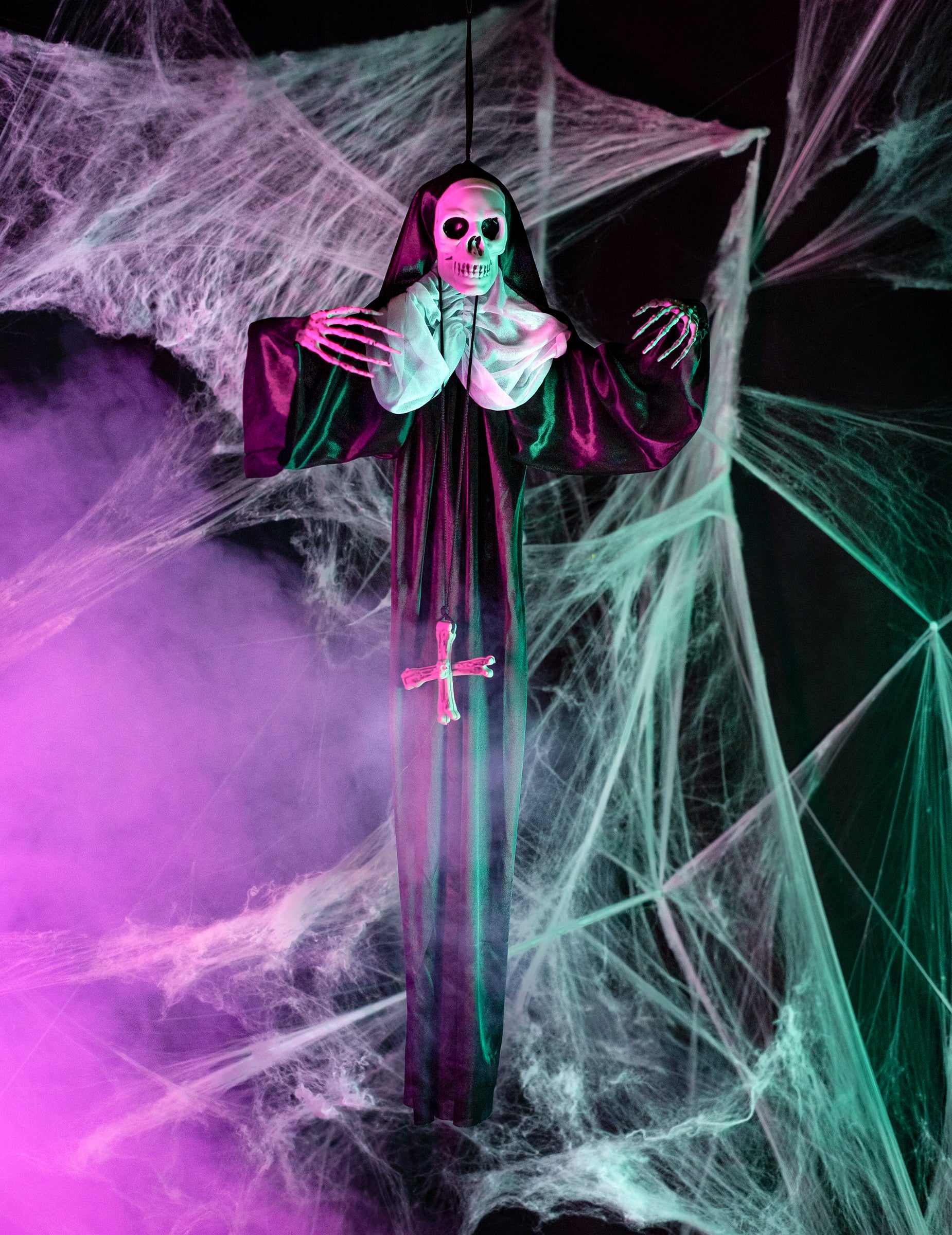 Tato závěsná dekorace zobrazuje kostru jeptišky. Měří přibližně 86 cm Je vysoká. Je oblečená v černém a má černobílou čelenku. Její kostlivé ruce a hlava jsou viditelné. Tato závěsná jeptiška bude perfektním doplňkem vaší halloweenské výzdoby.