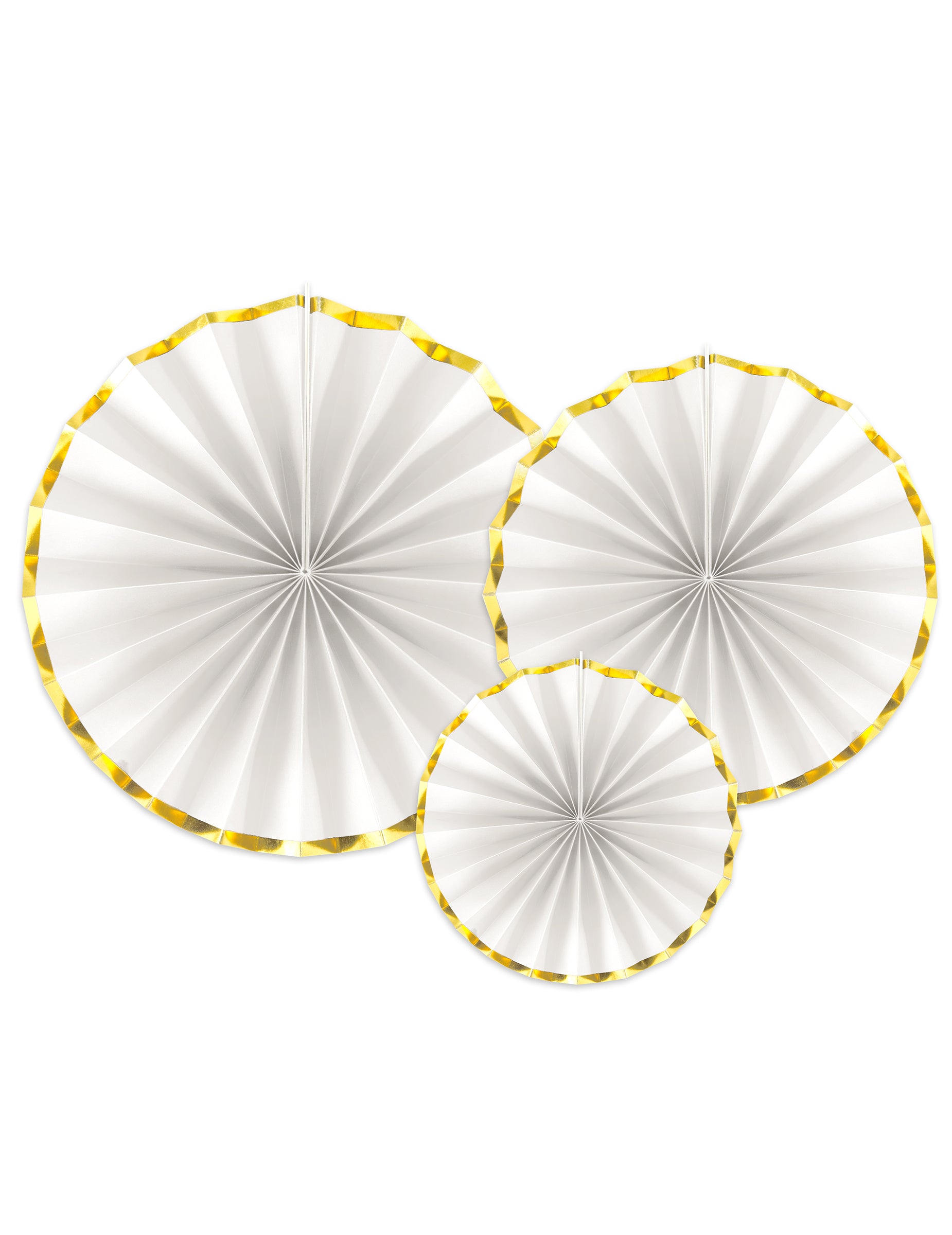 Vylepšete svůj párty pokoj tímto balíčkem 3 kusů rozety dekorativní papírové dekorace. Nabízí průměry 40, 32 a 23 cm, tyto bílé doplňky se zlatým povrchem vytvářejí elegantní vizuální efekt. Tyto rozety dokonale zapadají do dekorace potvrzení o svatba nebo a křest.