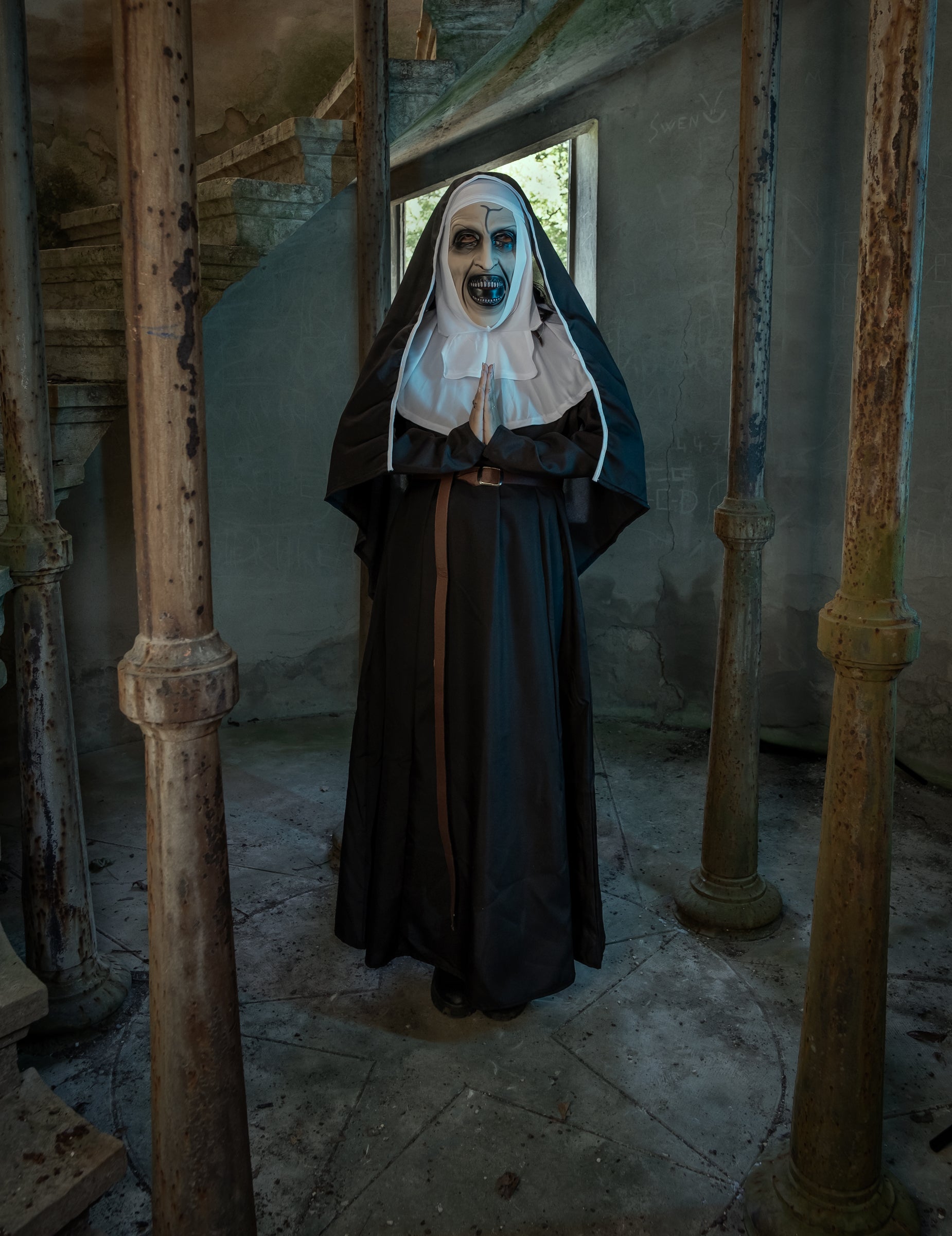 Tato sada obsahuje oficiálně licencovaný kostým jeptišky. Kostým se skládá ze šatů, pásku a masky s přišitou čelenkou. Černé šaty mají dlouhé rukávy. Přes šaty je připevněn hnědý pásek, který označuje pas. Maska je vyrobena z PVC a představuje strašidelnou tvář jeptišky. Pro lepší viditelnost je v oblasti očí prolamovaná. Na masku je přišita černá látková čelenka, která kostýmu dodává ještě větší realistický vzhled. Tento kostým bude perfektní pro vyděšení vašich blízkých na Halloween!