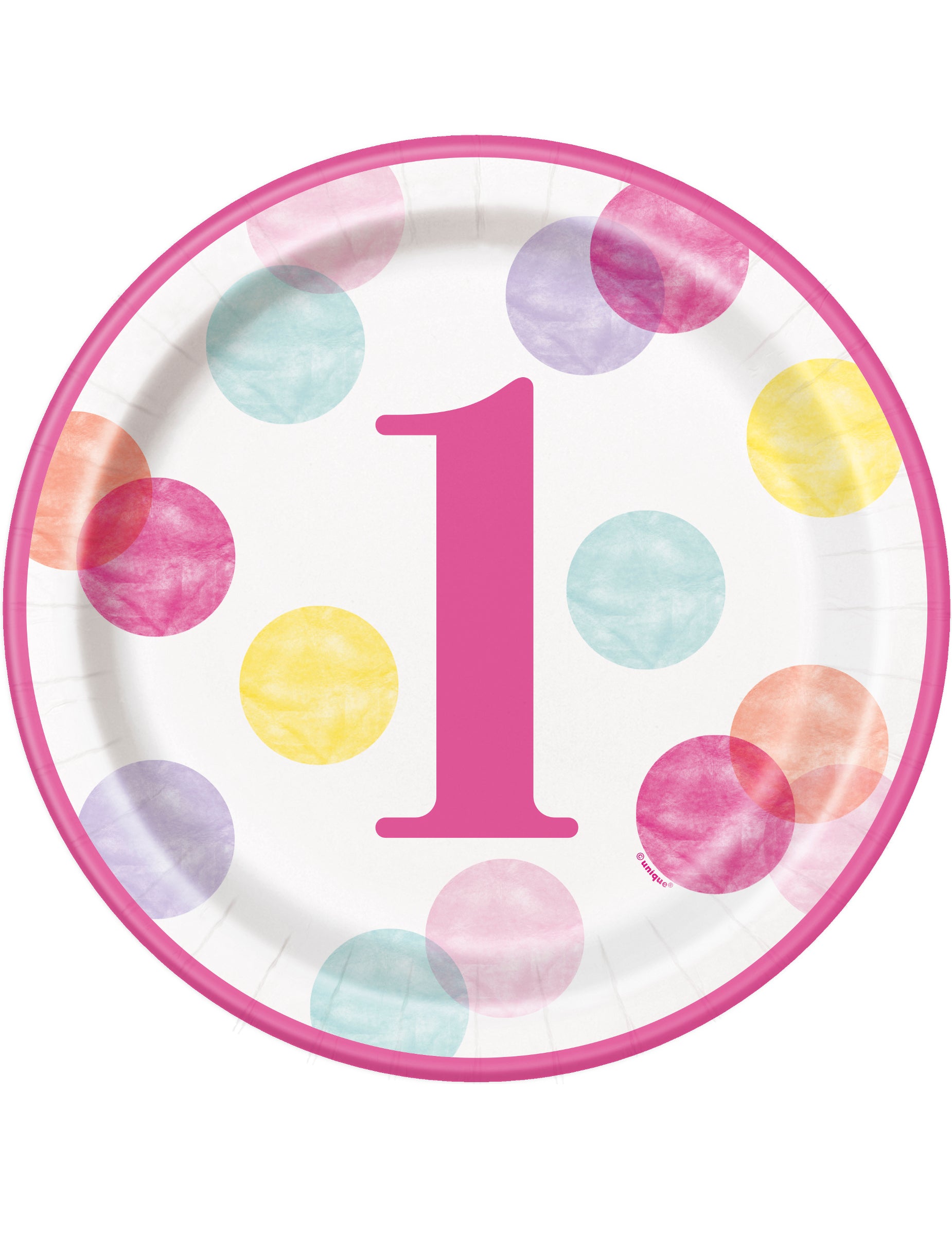 Tato šarže obsahuje 8 desky jednorázovky vyrobené z pevného kartonu. Každá deska měří přibližně 23 cm v průměru. Vyznačují se stylovým bílým a růžovým designem a jsou zdobeny barevnými puntíky a číslem 1 uprostřed. Tyto desky bude ideální pro vylepšení stolu během první narozeniny vaší holčičky.