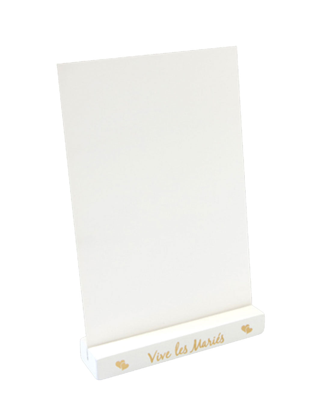 Toto držák menu Vyrobeno ze dřeva s elegantním bílým povrchem. Znázorňuje to nápis „Ať žije nevěsta a ženich“ zlatým písmem, obklopený okouzlujícími srdíčky.