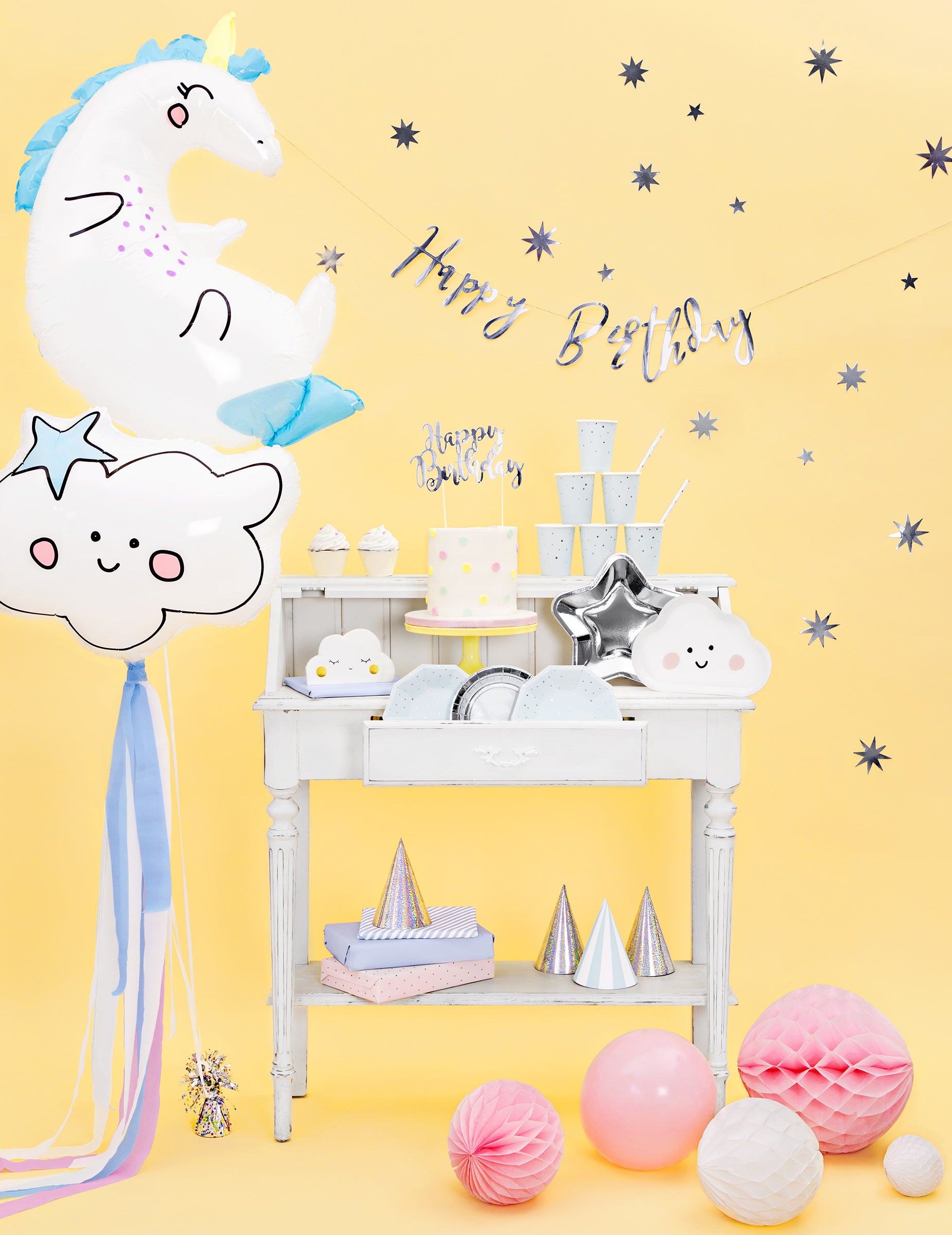 Vylepšete si tím svůj párty pokoj věnec v pevném kartonu. 62 dlouhé cm a výška 16,5 cm, nese nápis "všechno nejlepší k narozeninám“ v lesklé stříbrné barvě. Tento prvek je ideální pro dokončení vašeho narozeninová výzdoba téma s tímto věnec šik.