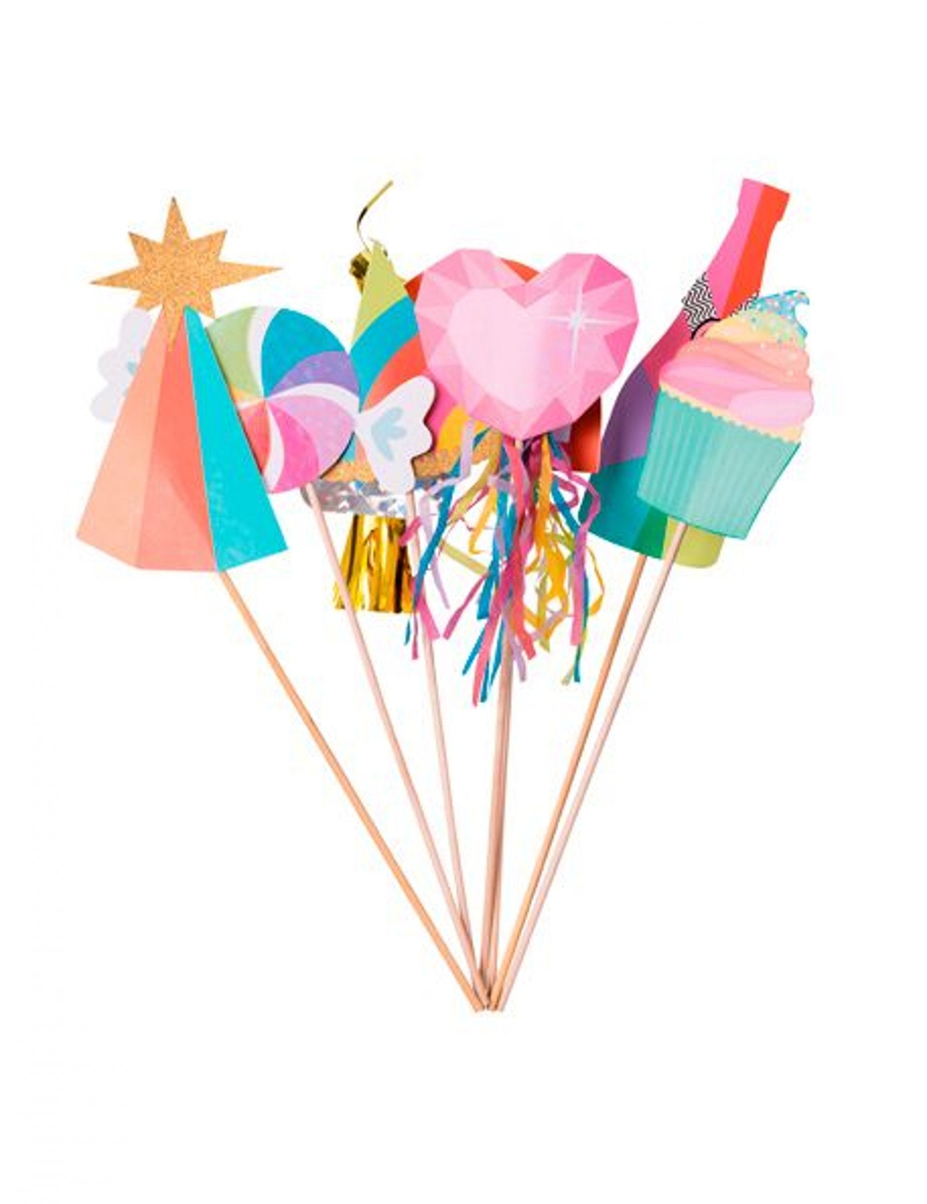 Oživte své akce tímto sada fotobudky originál včetně 7 lesklých doplňků zdobených barevnými třásněmi. Namontované na dřevěných tyčích poskytují vynikající přilnavost pro vaše fotografie.