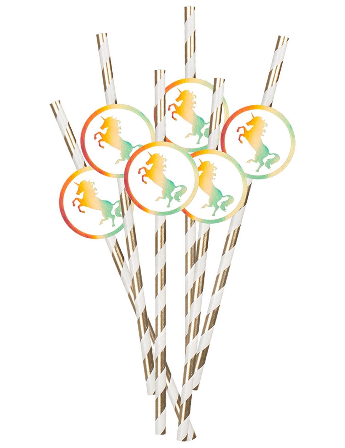 Tato kartonová brčka s motivem jednorožce se prodávají v balení po 6 kusech. Měří přibližně 20... cm a jsou bílo-zlaté pruhované. Brčka zdobí kartonový medailon, který představuje jednorožce s holografickým efektem. Budou perfektním doplňkem vašeho narozeninového stolu s jednorožcem!