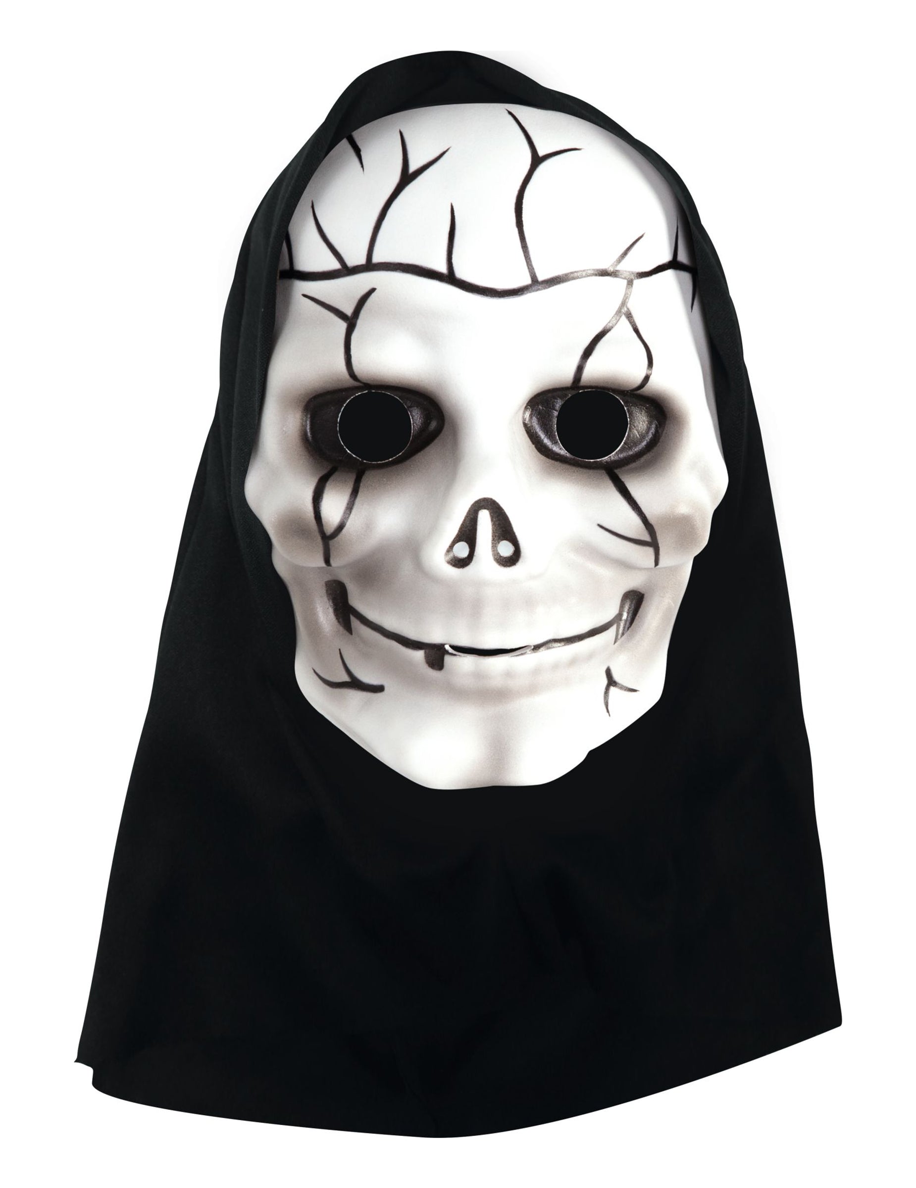 Tato dětská kosterní maska ​​představuje bílou lebku. Černé čáry jsou na to malované. Tato maska ​​má otvory pro oči a nos. Je upevněna na černé kapuci. Tato maska ​​bude ideální pro dokončení kosterního kostera na Halloween večer.