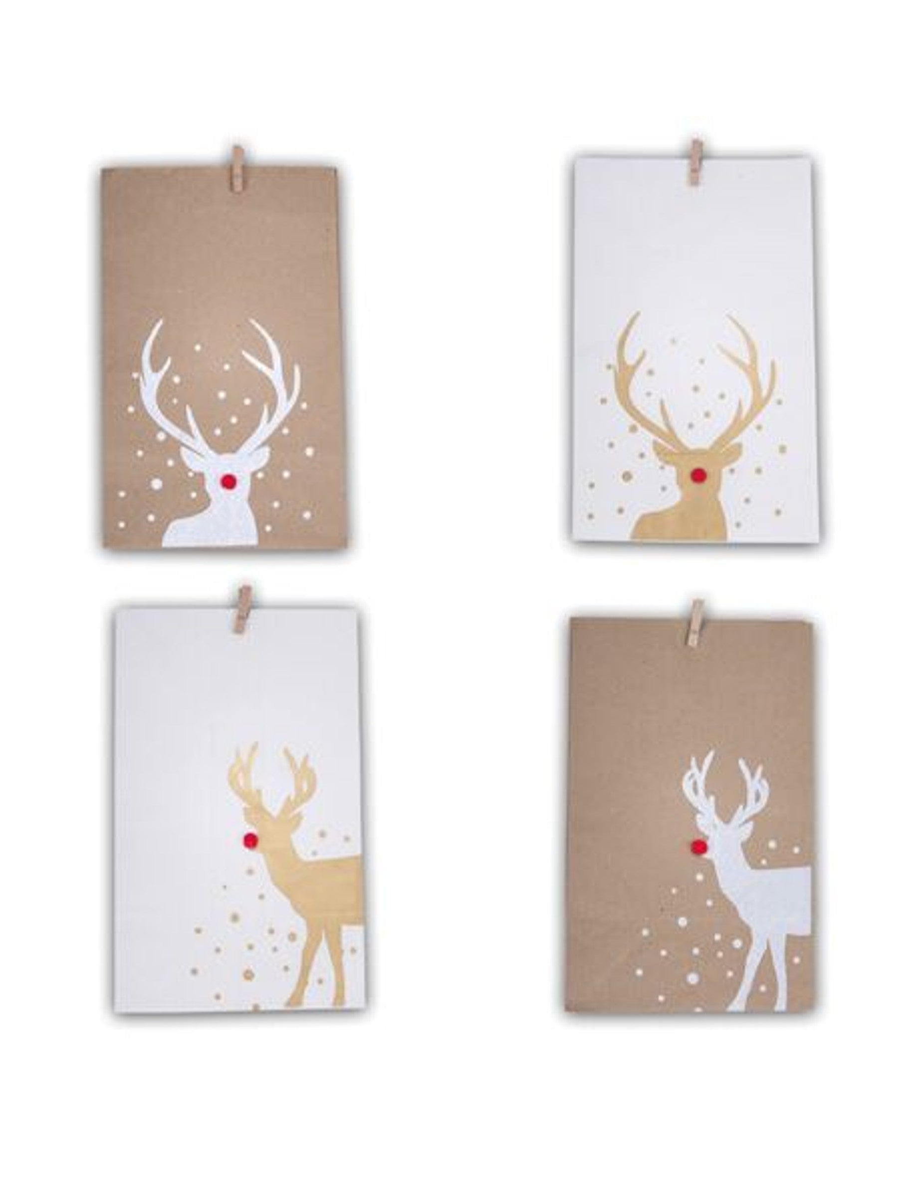 Tato šarže obsahuje 4 sáčky v kraftovém a bílém papíře o rozměrech 29 x 17,5 cm. Ilustrováno přátelsky sobů s červeným bambulovým nosem dodají vašim dárkům slavnostní nádech. Můžete je snadno utěsnit pomocí malých kolíčků na prádlo. Je to ideální obal pro distribuci vašich čokolád a malých dárků během období Vánoce.