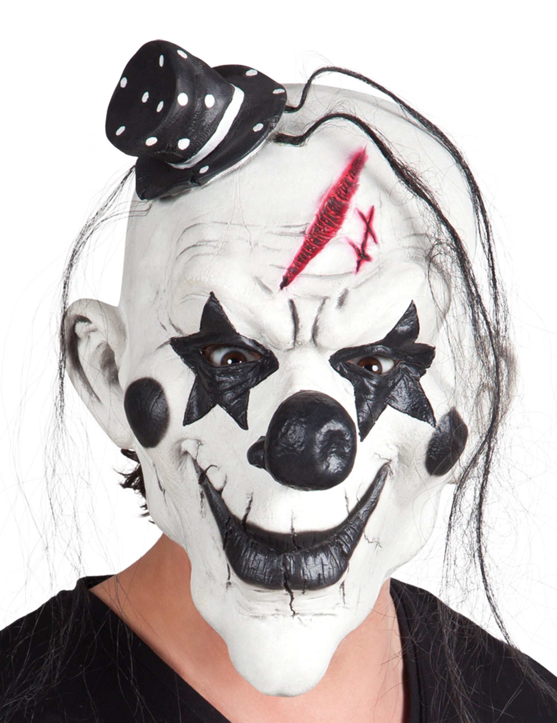 Ce masque clown psycho est en latex, il est noir et blanc avec des cheveux noirs. Un chapeau de couleur noire avec des points blancs est fixé en haut du crâne. La bouche ainsi que le contour des yeux et les pommettes sont noires, pour apporter l'aspect sombre et terrifiant. Une ouverture est présente au niveau des yeux. Une fausse cicatrice rouge est située sur le front. Ce masque sera parfait pour terrifier vos amis le soir d'Halloween.