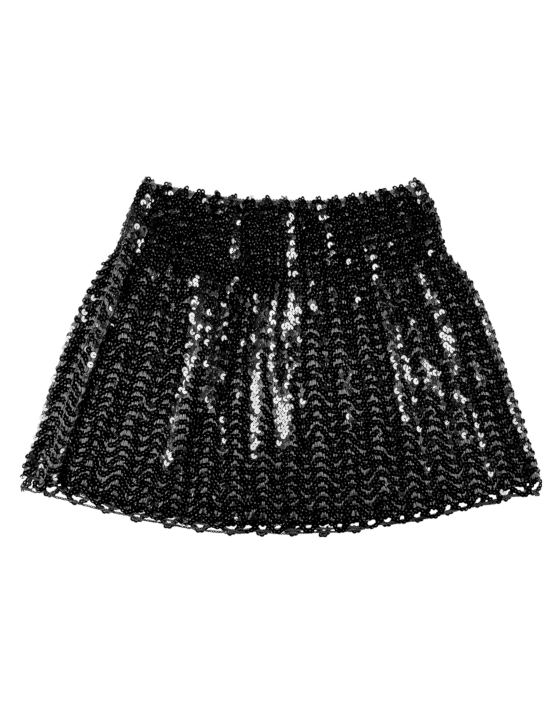 Sukně této ženy je černá. Má elastickou velikost, která se nejlépe přizpůsobí vaší morfologii. Je pokryta černými flitry, které budou celek brilantní. Tato sukně bude ideální pro dokončení disco kostýmu během večera maskovaného s přáteli.