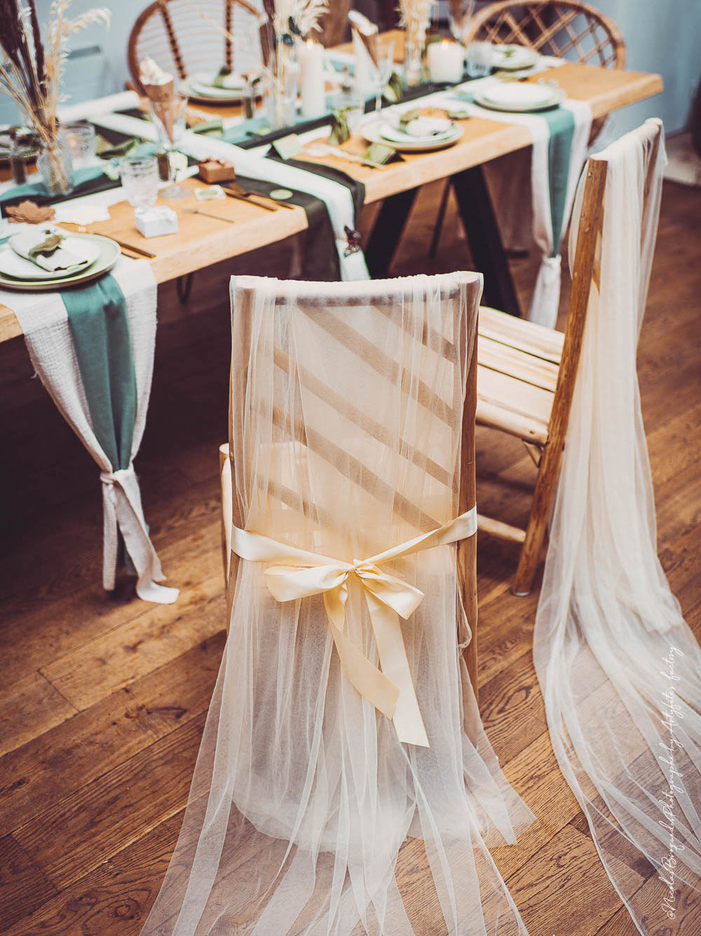 Tento pozemek se skládá ze 2 velkých plachty židle splývavé a sladěné saténové stuhy.