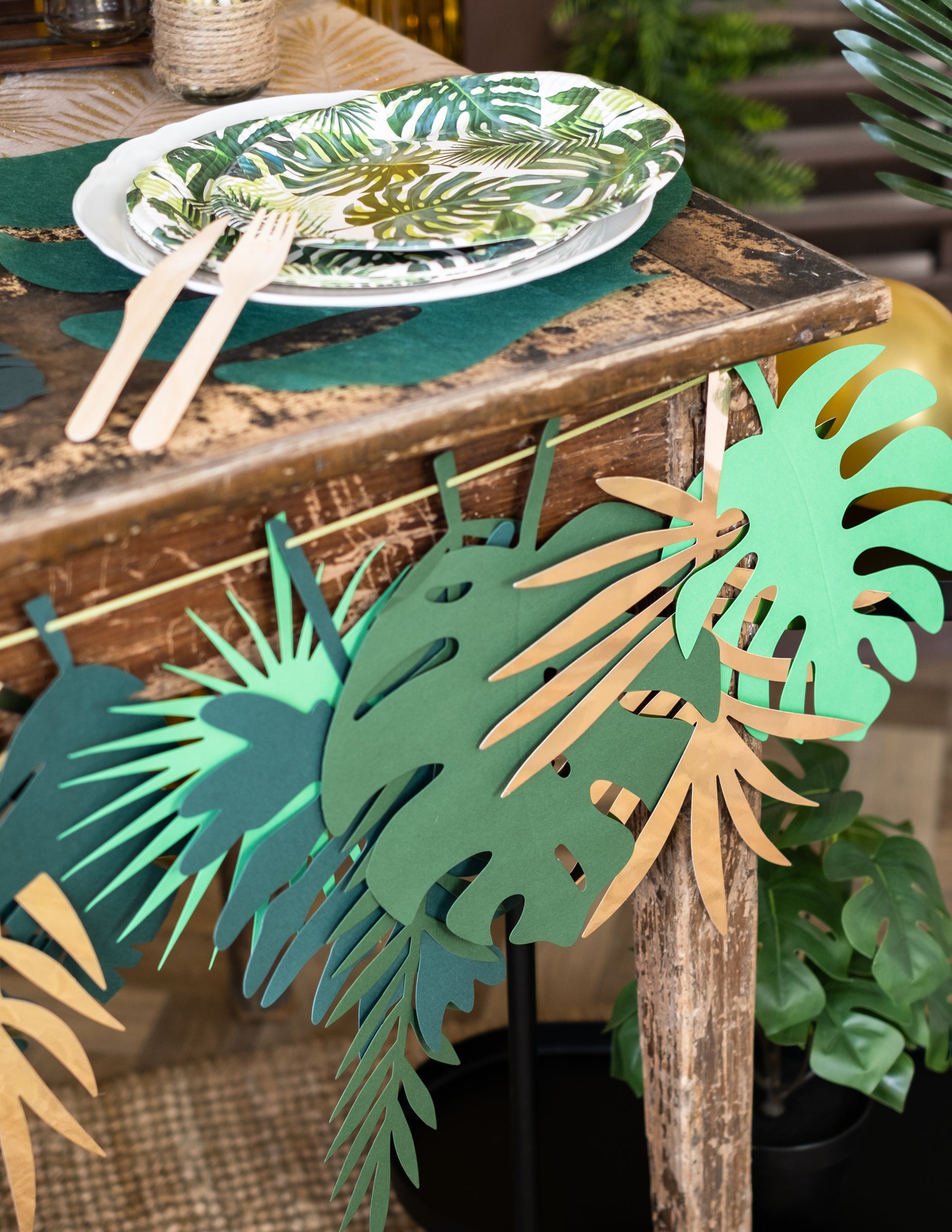 Toto lepenková girlanda měří na délku přibližně 2 metry a skládá se z tropické listy ve zlatých, světle zelených a tmavě zelených tónech.