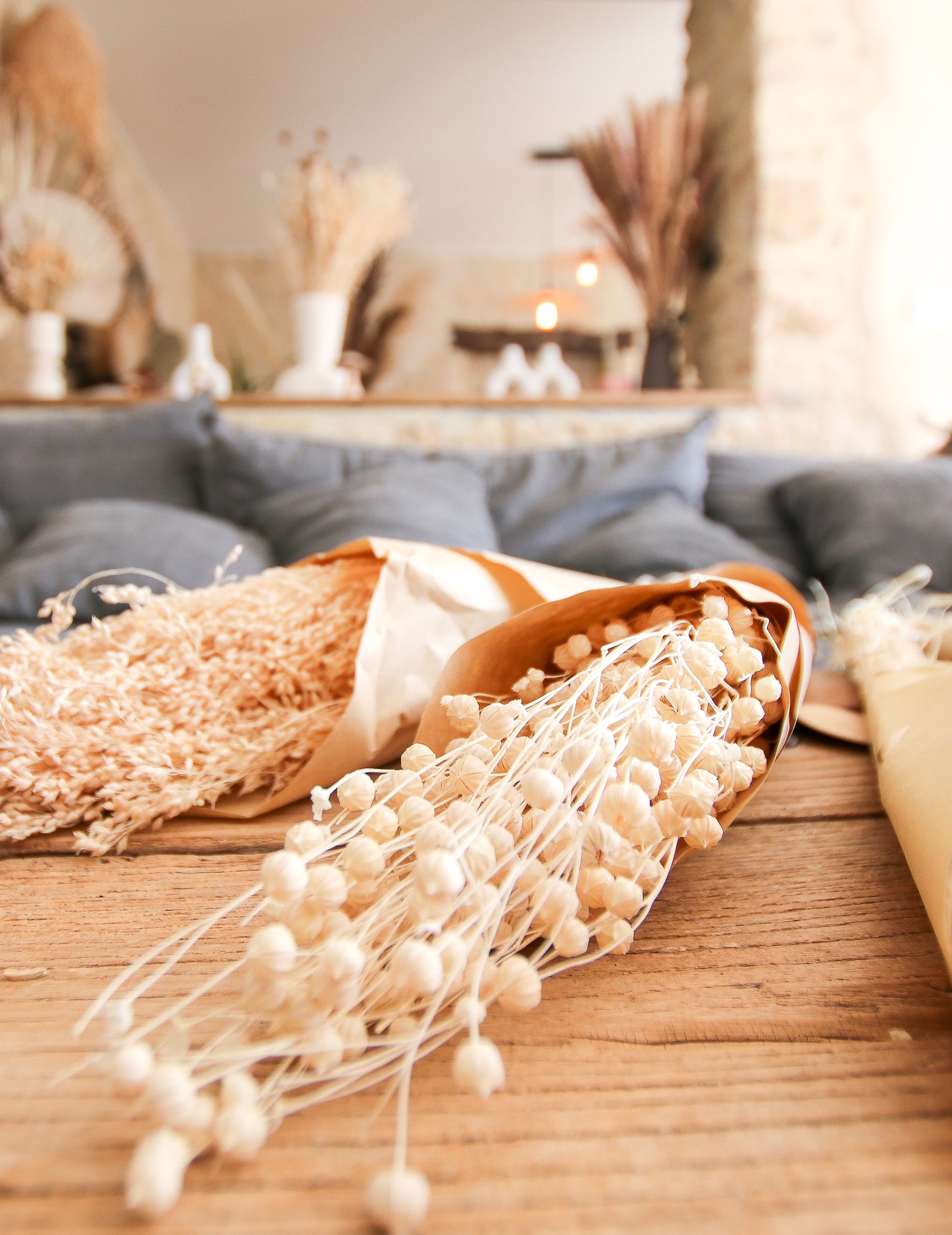 Vneste do své dekorace dotek autenticity s touto kyticí přírodní sušené prádlo o váze cca 50 g. Jeho dlouhé pruty 70 cm jsou ideální pro prezentaci ve velké váze nebo naaranžované na běhounu. Tento produkt je ideálním prvkem pro vytvoření atmosféry bohémský a rafinované během a svatba nebo jiné slavnostní události.