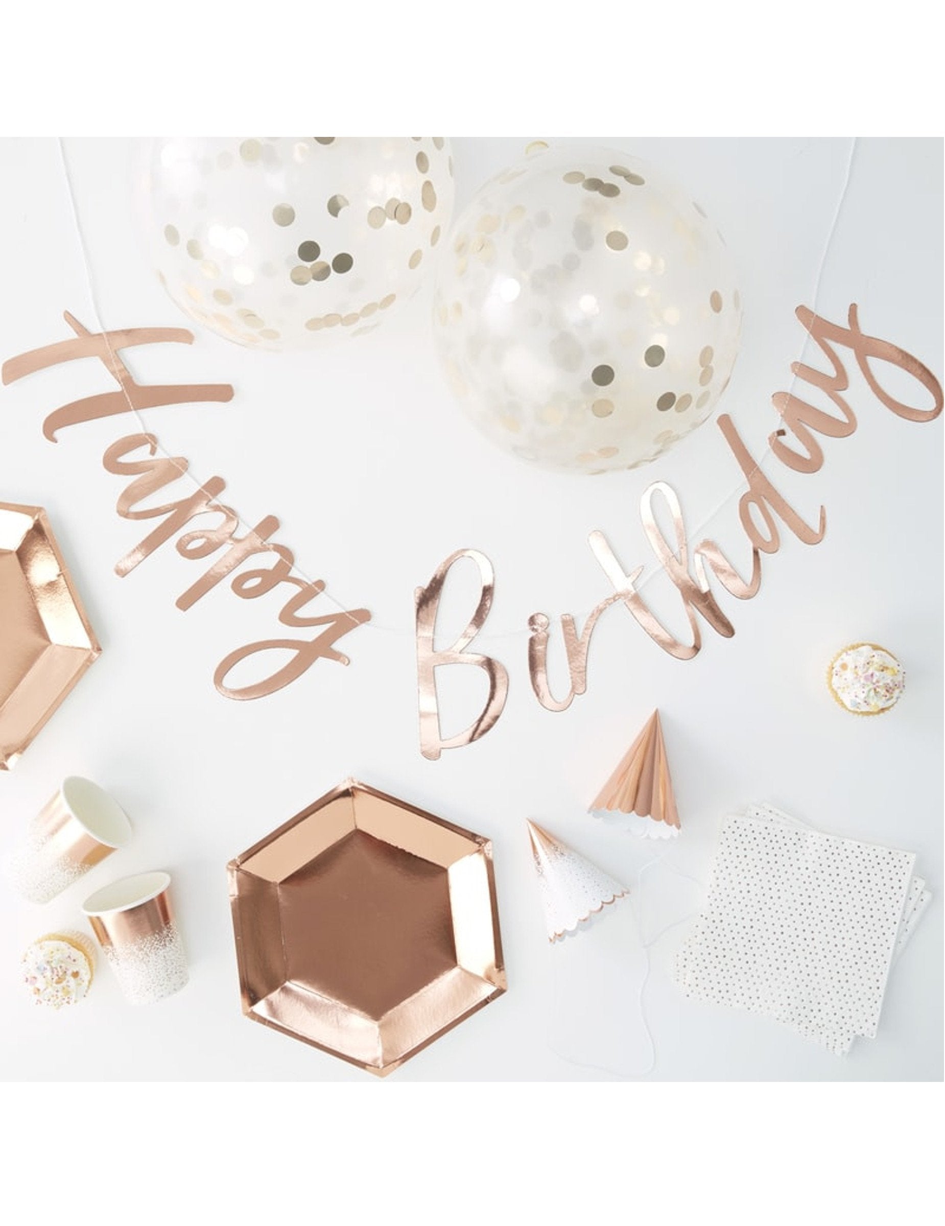 Vylepšete svůj večírek tímto narozeninový kit celkový počet 70 kusů. Tato praktická sada obsahuje 16 destiček z růžového zlata (25 cm), 16 bílých ubrousků posetých puntíky (33 x 33 cm po otevření), 16 elegantních sklenic a 16 koordinujících špičatých klobouků. Dekoraci doplňuje 5 balónků naplněných konfetami po 30 cm a 1,8metrová girlanda Happy birthday. Vše je naplánováno na vytvoření a narozeniny růžové zlato šumivé a snadno se nasazují.
