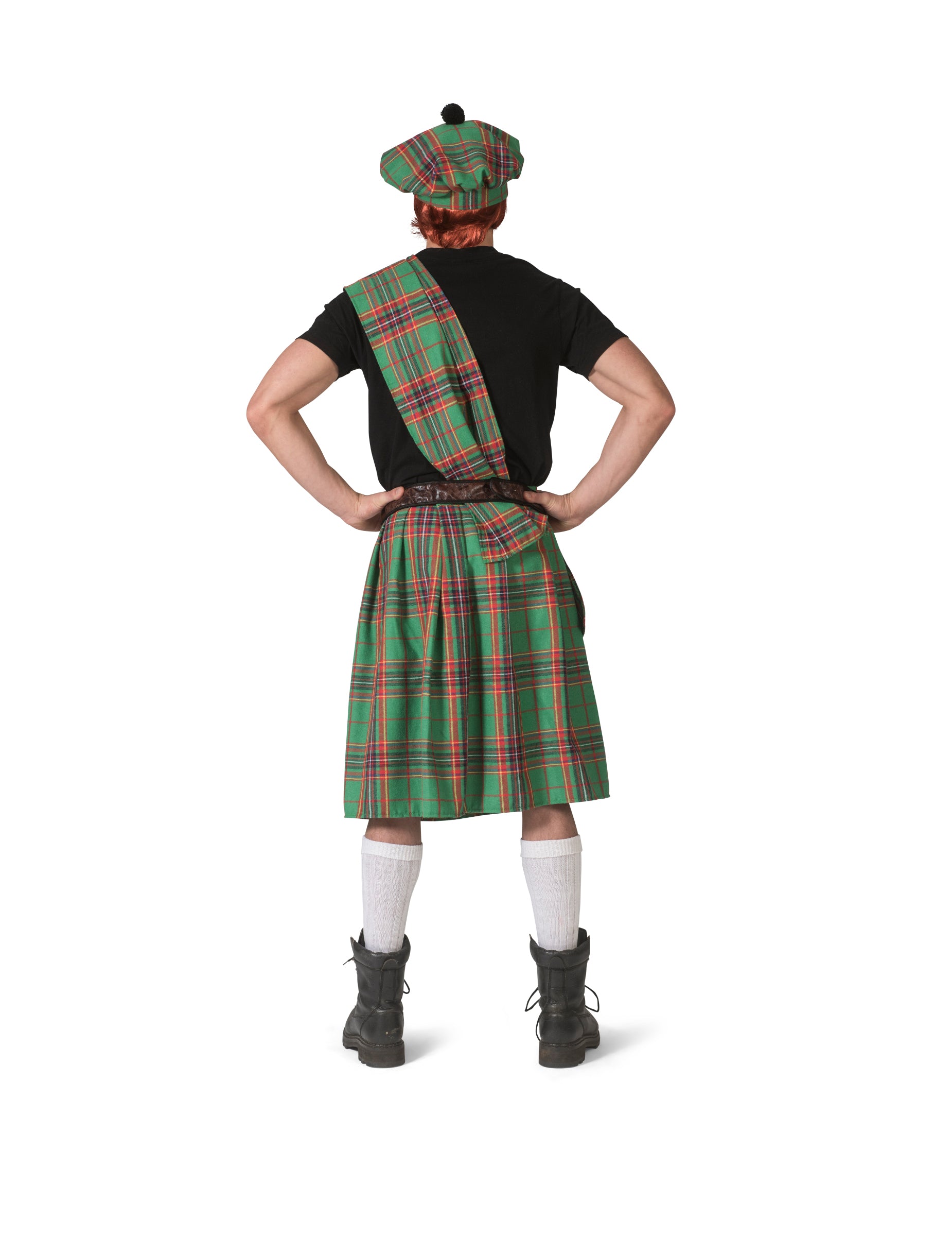 Skotský kilt má zelený tartanový vzor. Součástí je také šála, která se přehodí přes rameno.