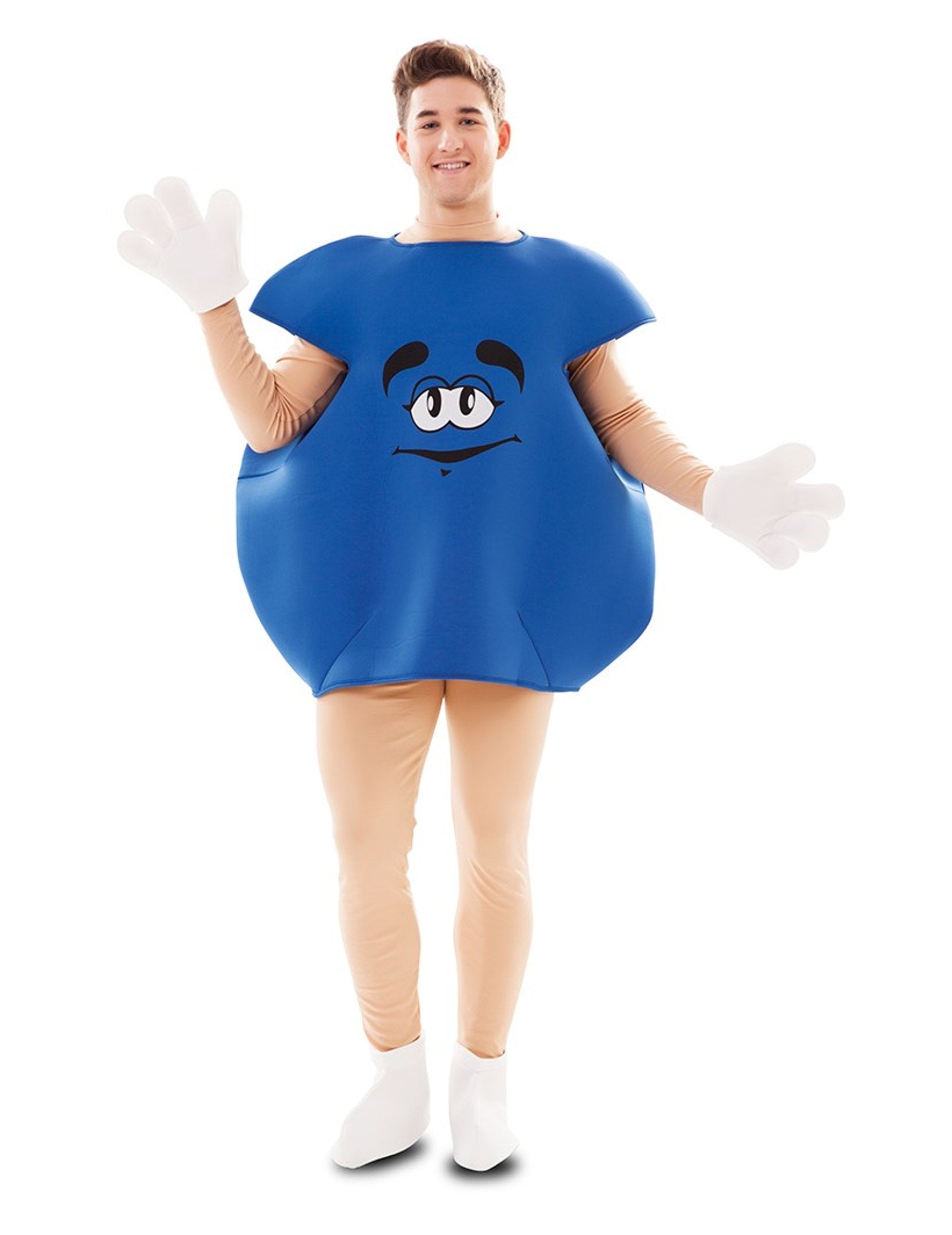 Tento modrý kostým bonbónů pro dospělé obsahuje tuniku, rukavice a boty (body není součástí balení). Overal má tvar modrého míče s očima, ústy a obočím potištěným na přední straně. Tento látkový overal je vycpaný pěnou, aby si zachoval tvar míče. Rukavice a návleky na boty jsou bílé a podšité pěnou. Zvolte humor na kostýmní párty s motivem postavičky!