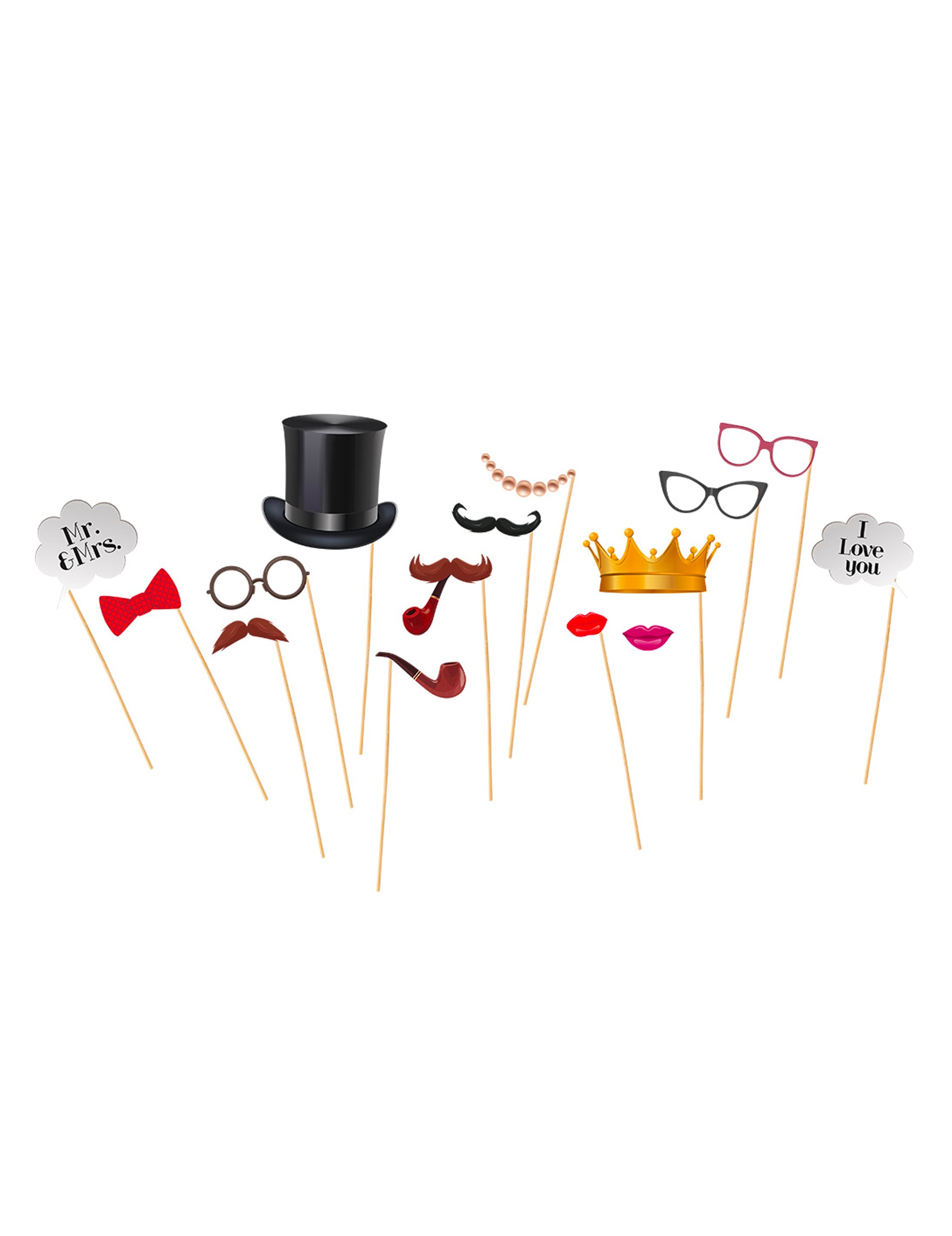 Zabavte tím své hosty vintage sada fotobudky složený z 15 různých doplňků. Tato kompletní sada obsahuje cylindr, dvě chatovací bubliny „Mr & Mrs“ a „Miluji tě“, motýlka, tři páry brýlí, dva kníry, knír s dýmkou, dýmku, náhrdelník, korunku a dvě ústa. Zvěčněte jedinečné okamžiky během svého svatba s tímto sada fotobudky s retro šarmem.