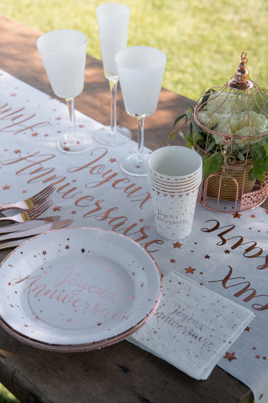 Tato šarže obsahuje 10 narozeninové talíře z bílého kartonu s obrysem v barvě růžového zlata. Každý kus je ozdoben motivem hvězd a nese poselství „ Všechno nejlepší k narozeninám » elegantně vepsáno uprostřed.
