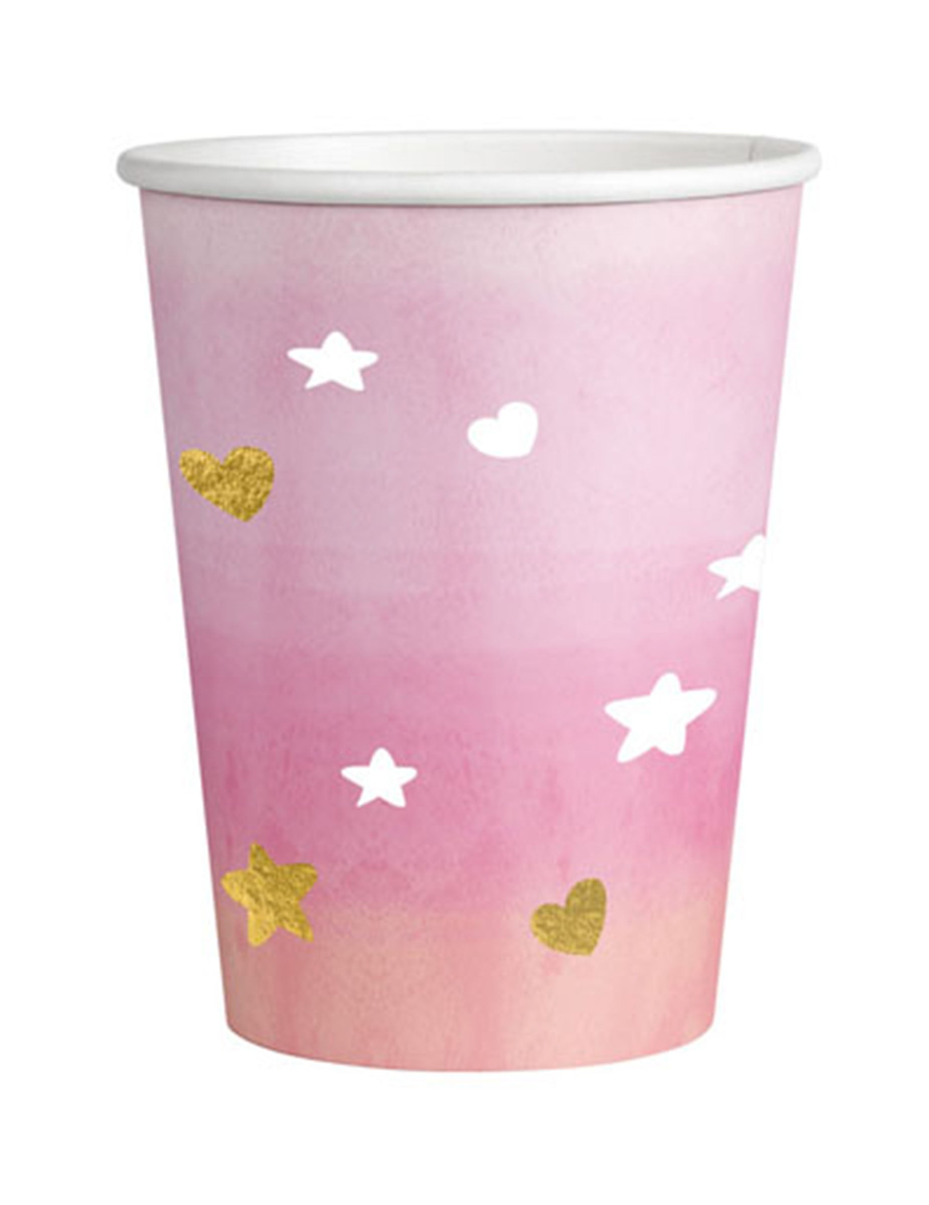 Vneste na svou akci dotek sladkosti s touto sadou 8 kusů poháry jednorázový karton o objemu 250 ml. Tyto nádoby se vyznačují elegantním přechodem růžové zdobeným zlatými a bílými vzory ve tvaru hvězd a srdce. Tyto poháry jsou ideální pro vylepšení dekorace stolu a miminko nebo oslavit a 1. narozeniny památný.