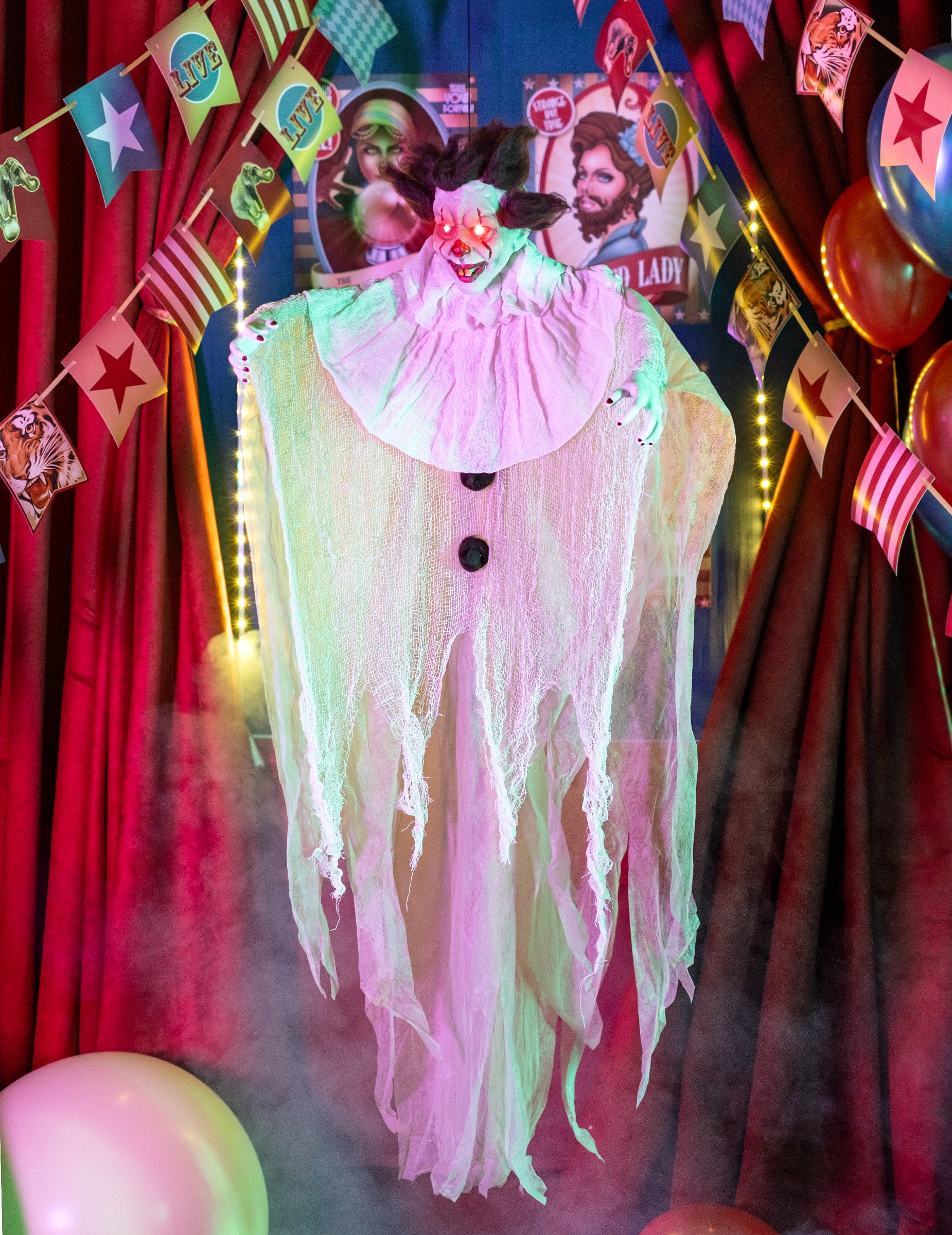 Tato závěsná dekorace zobrazuje klauna-zabijáka. Je oblečený v bílých a béžových látkách s vybledlým vzhledem. Jeho obličej je bílý s černými rysy. Jeho nos je nakreslený tmavě červenou barvou, stejně jako jeho ústa. Dekorace měří přibližně 130 cm. cm na délku. Bude perfektní pro vytvoření strašidelné cirkusové dekorace na Halloween.