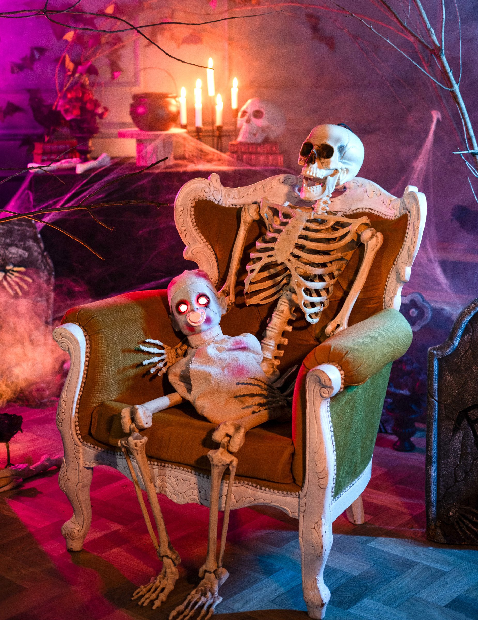 Tato dekorace s malým zombie měří přibližně 50 cm. Je světelná a zvuková (baterie nejsou součástí balení). Tato dekorace představuje miminko zabalené v krví potřísněném prostěradle s bílýma očima, obličejem plným jizev a dudlíkem v puse. Toto miminko má dva způsoby, jak rozsvítit oči a křičet. Buď přepnete vypínač na zadní straně do demo režimu, miminko bude řvát asi 30 sekund. Pokud jej přepnete do polohy „zapnuto“, stačí stisknout hrudník dítěte a začne svítit a řvát. K ovládání této dekorace budete potřebovat 3xAA baterie. Jediné miminko, které pravděpodobně vyděsí vaše přátele během Halloweenu, je toto! Tato dekorace není hračka pro děti.