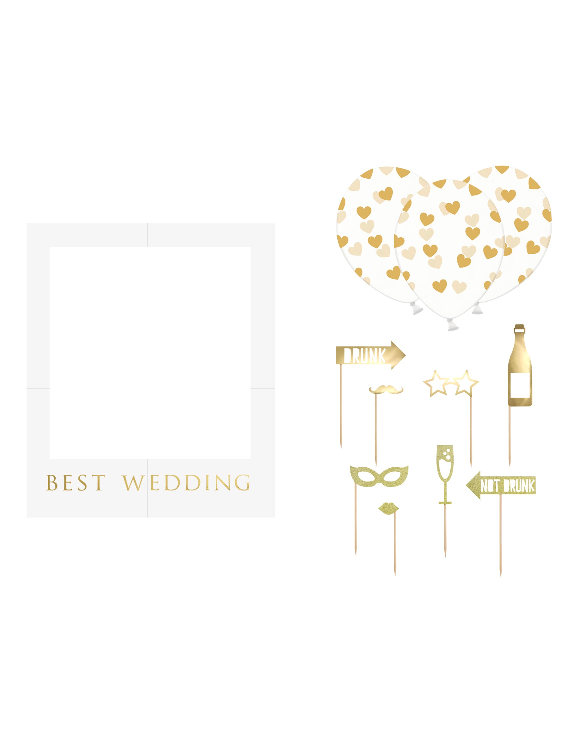 Kompletní sada bílé a zlaté svatební fotobudky 12 kusů s rámem