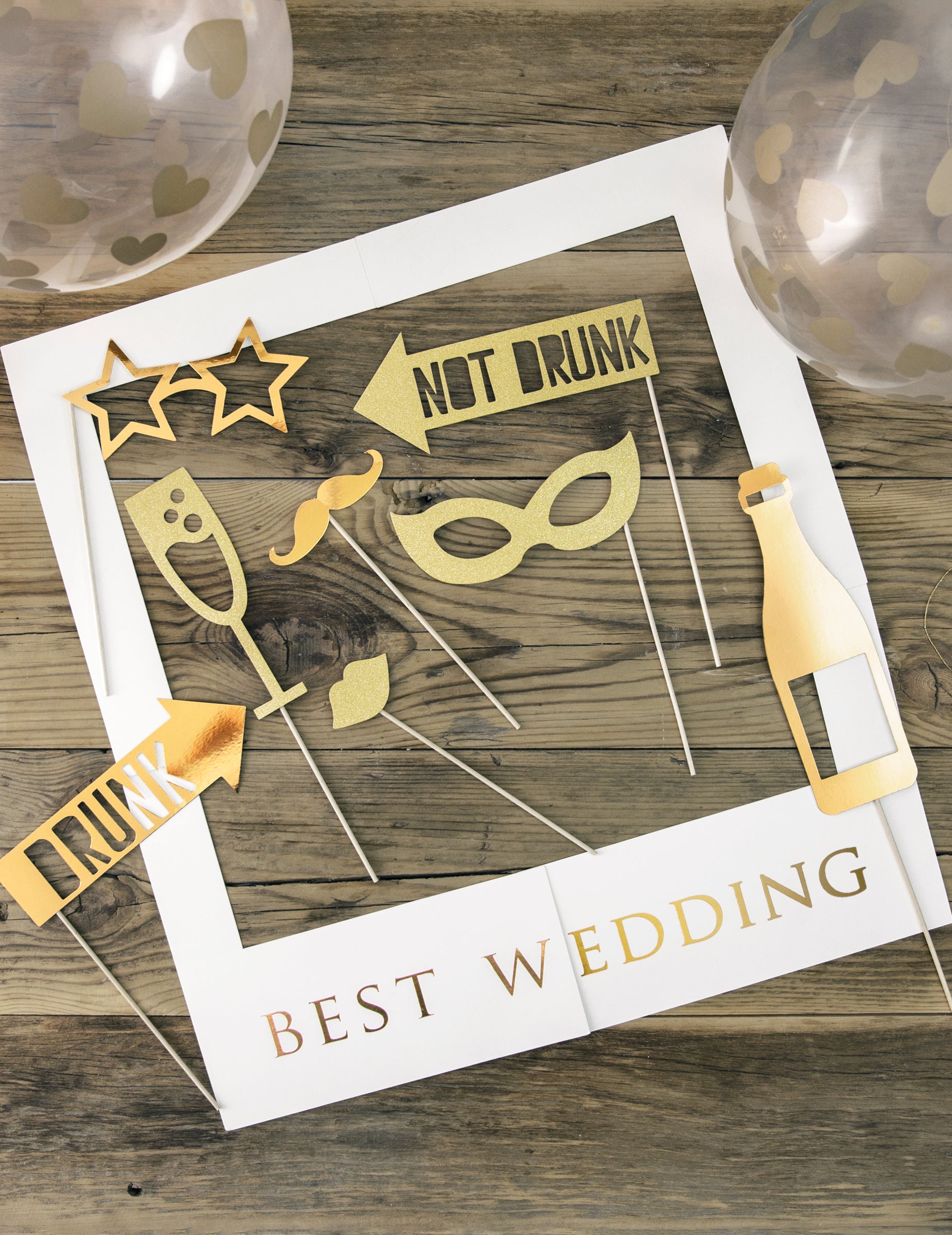 Toto sada fotobudky se skládá z kartonových nálepek připevněných na tenké dřevěné tyče. Je to perfektní animace, která vám dodá elegantní a zábavný dotek svatba.