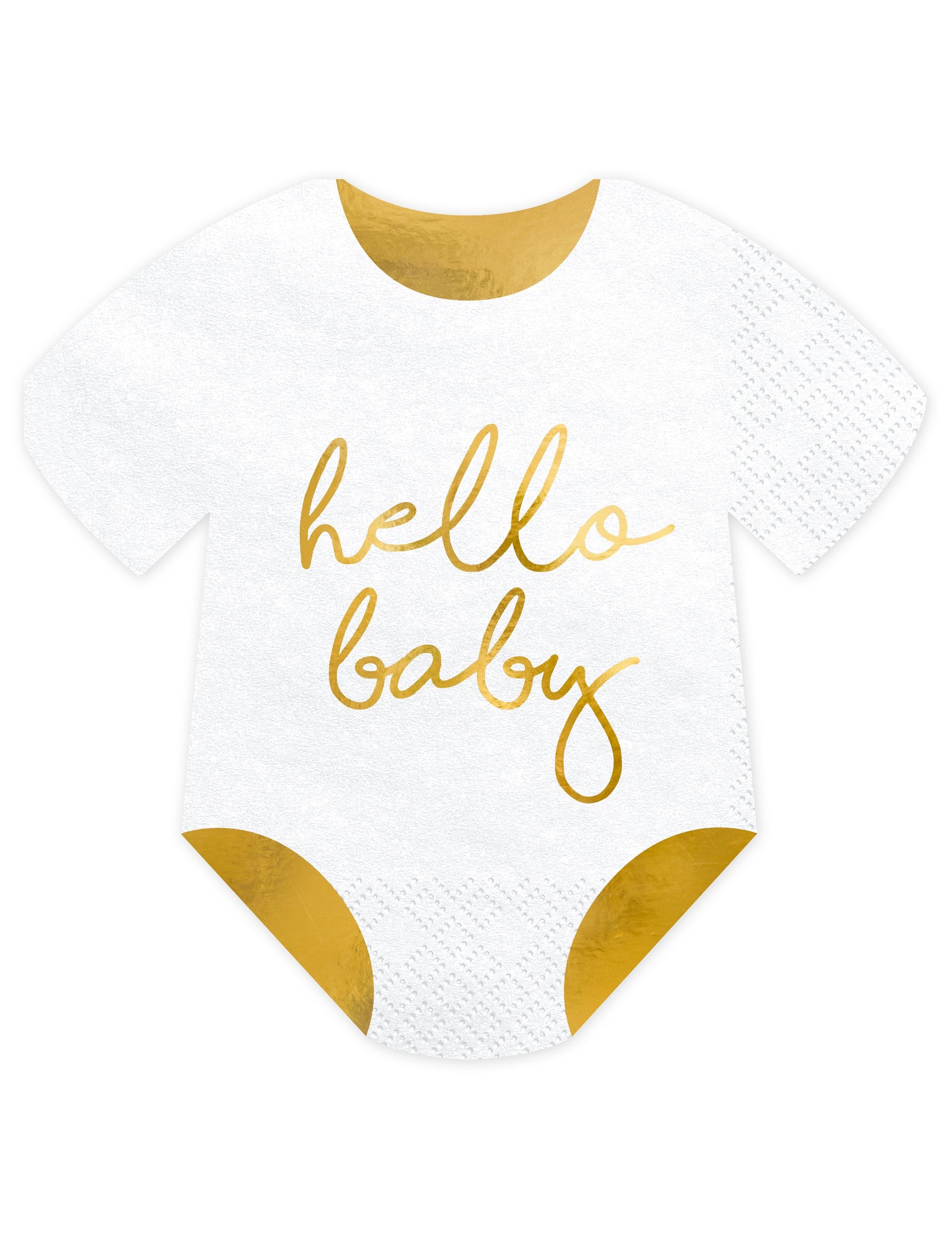 Sublimez votre fête avec ce lot de 20 serviettes de table en forme de body. Ces serviettes en papier aux teintes blanches et dorées mesurent 16 x 16 cm. Chaque pièce arbore la mention hello baby dans une élégante police dorée. C'est l'élément parfait pour décorer votre table et charmer vos convives pendant une baby shower !