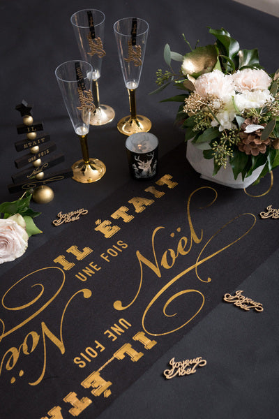Vneste s tímto dotek elegance na váš Silvestr bavlněný běhoun na stůl kdysi vánoce 3 m na 28 cm. Tento černý model vyniká svým slavnostním nápisem zlatým písmem. Je to ideální doplněk k dokonalosti vašeho Vánoční dekorace v elegantním a kontrastním stylu. Jednoduše to zařiďte stolní běžec pro zpestření vašeho přijetí na konci roku.