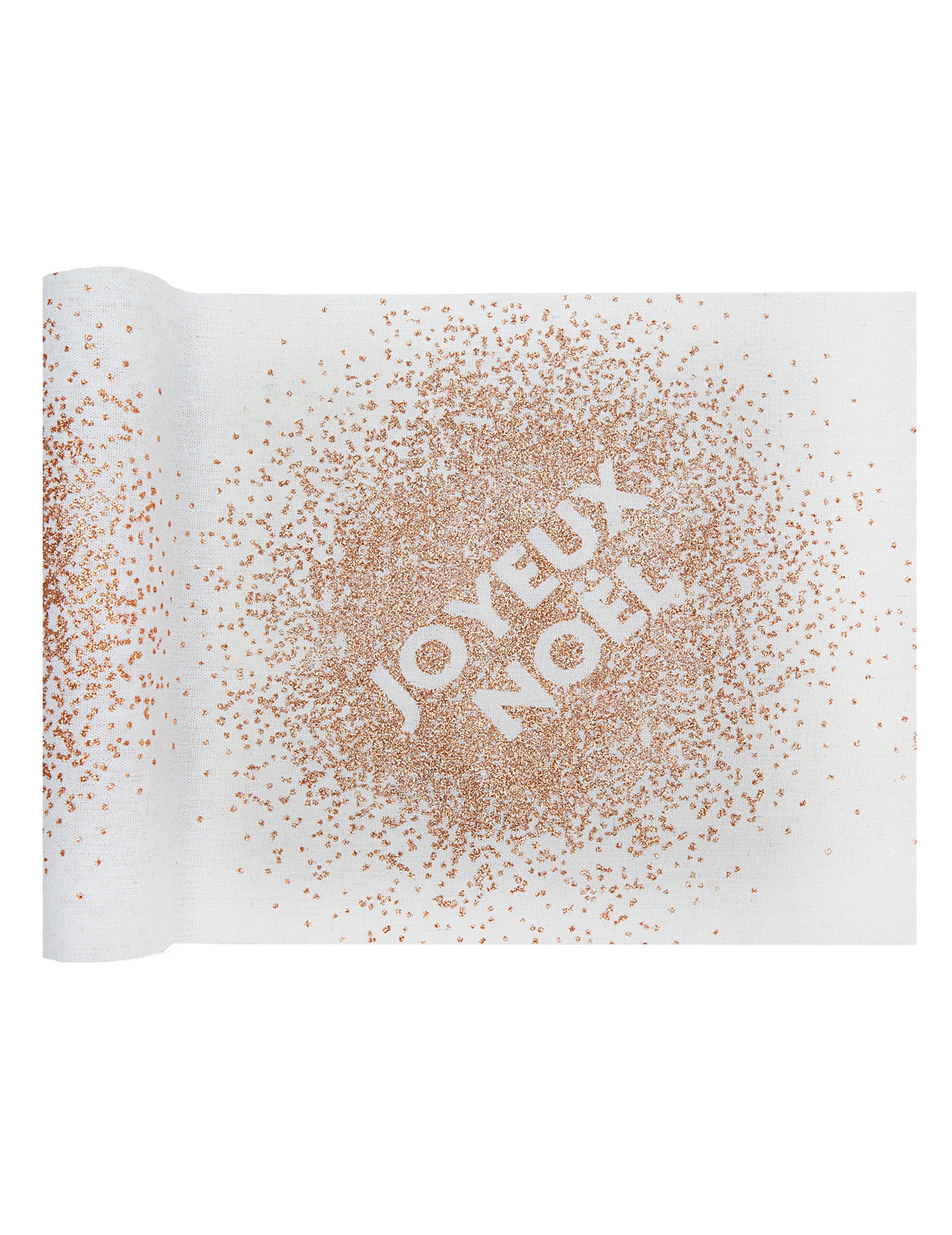 Veselé Vánoce bílý bavlněný běhoun na stůl s flitry z růžového zlata 3 m x 28 cm