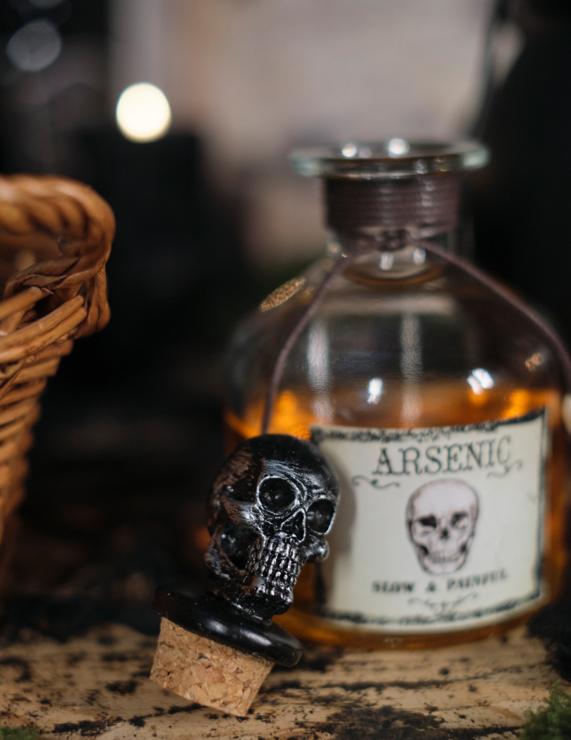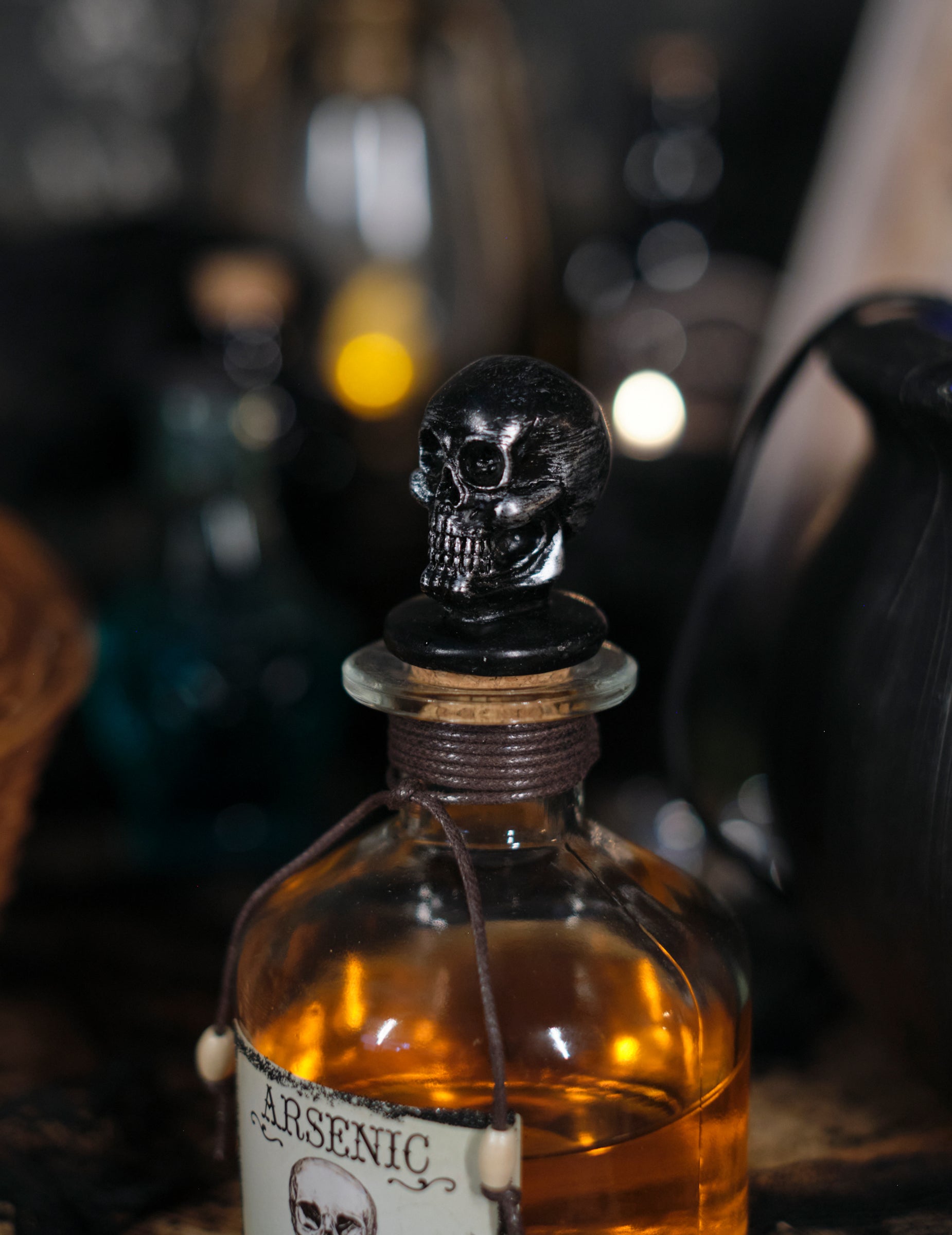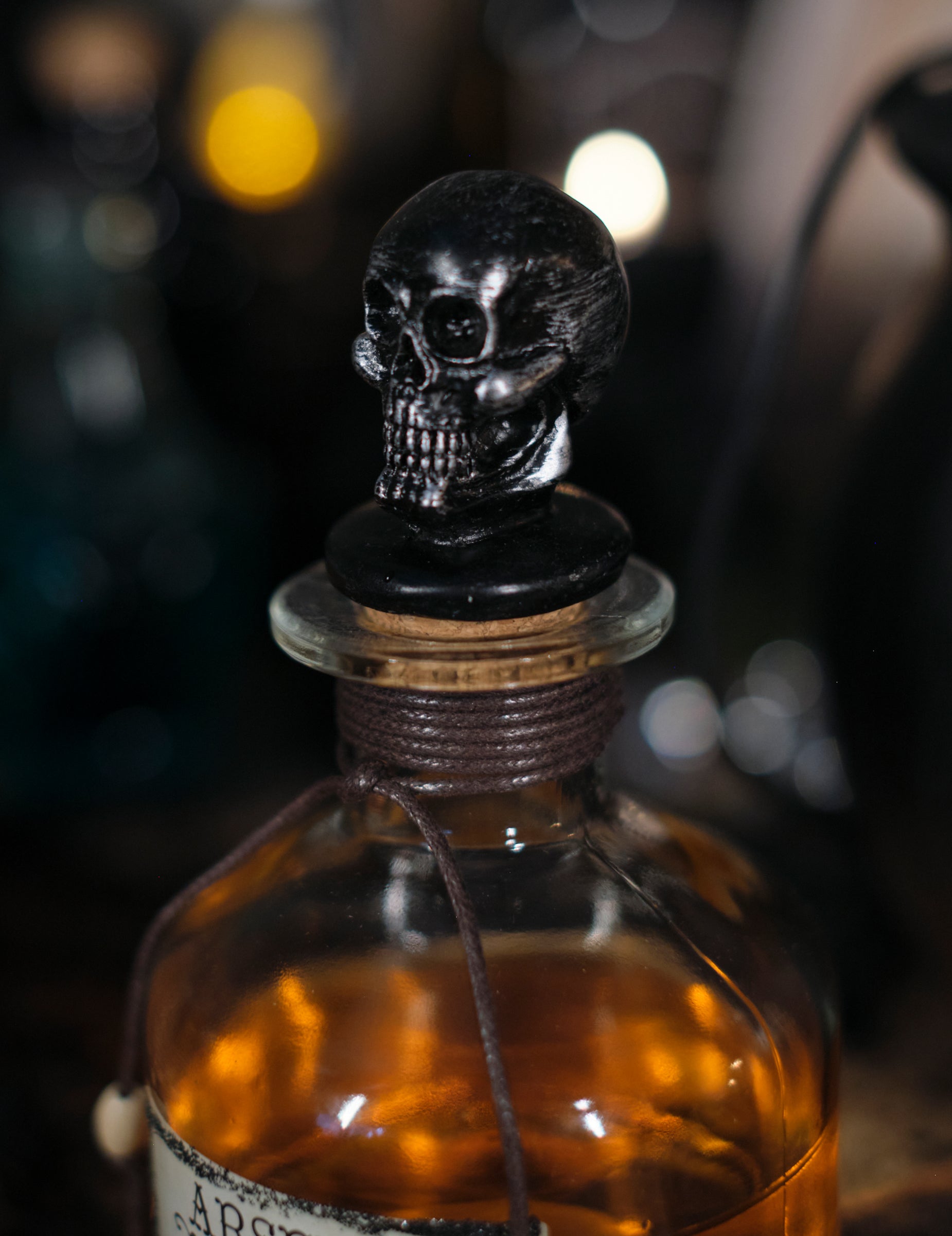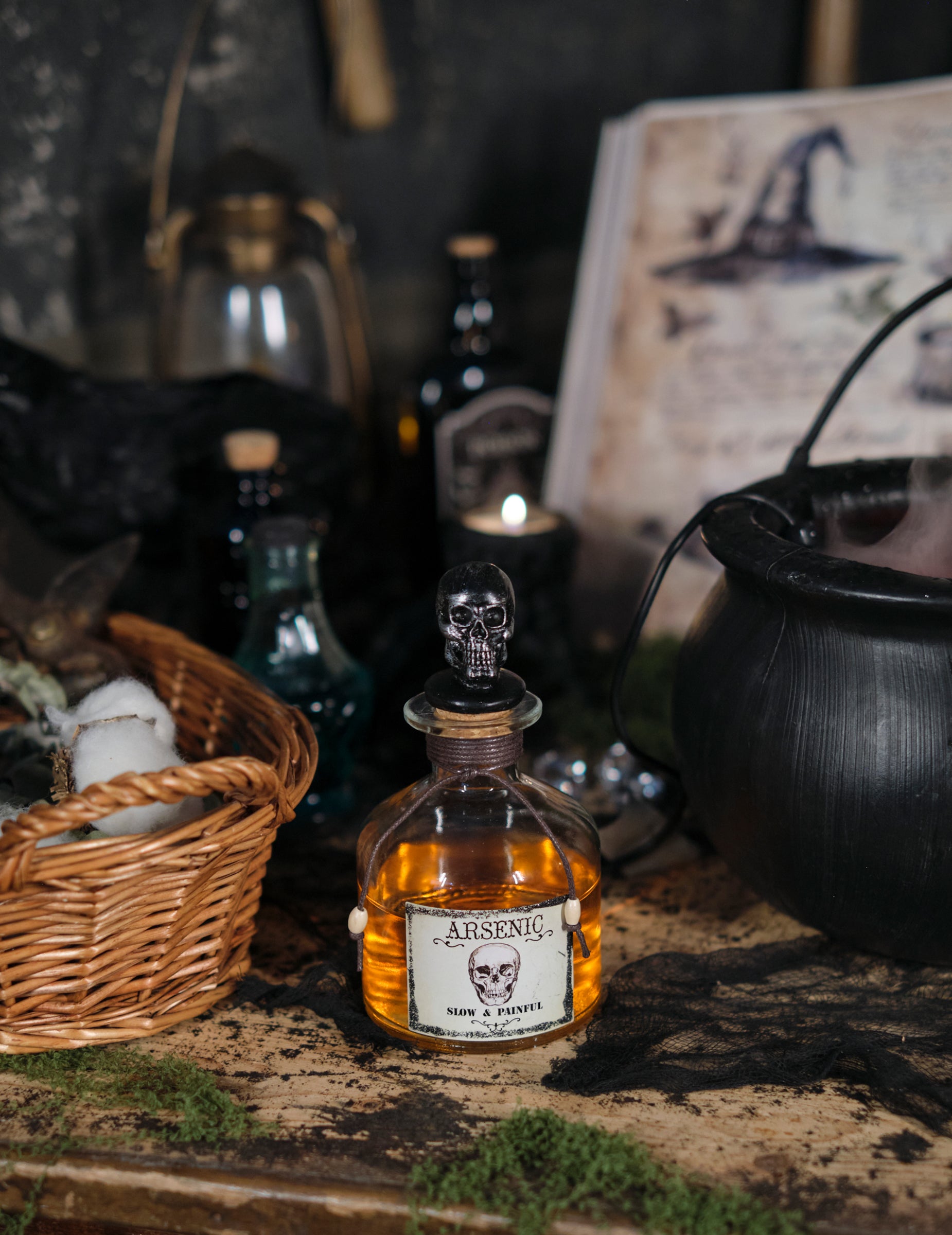 Se svými 16 cm Tato lahvička s výškou 32 cm má strašidelný retro štítek a tvarovanou lebku, které dodávají na jejím zlověstném půvabu. Je omotaná provazem a vyznačuje se promyšlenými detaily a je perfektním doplňkem dekorace inspirované staromódními skříňkami na jedy. Ideální pro vylepšení temného a podmanivého prostředí.