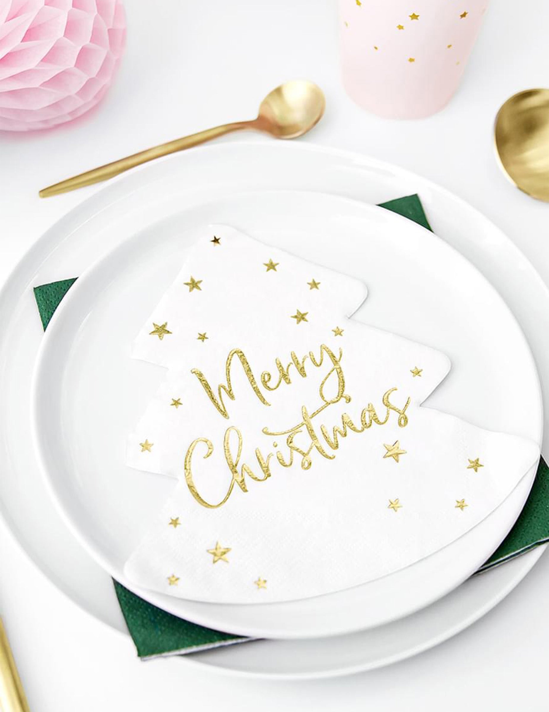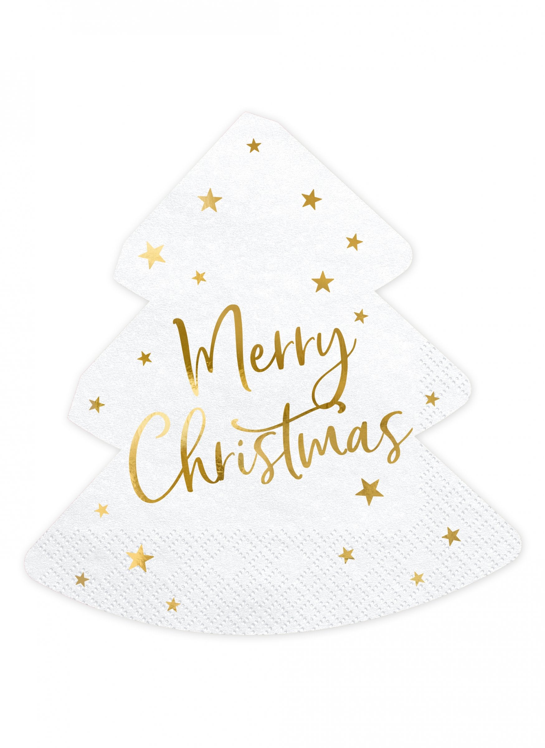 Vylepšete si výzdobu stolu s těmito 20 papírových ubrousků originály o rozměrech 16 x 16,5 cm. Představují se ve tvaru bílého stromečku a zobrazují pěkné hvězdicové vzory a vzkaz „veselé Vánoce“ ve zlaté barvě. Tyto elegantní doplňky budou nezbytné pro úspěch Vánoční jídlo a potěšte své hosty.
