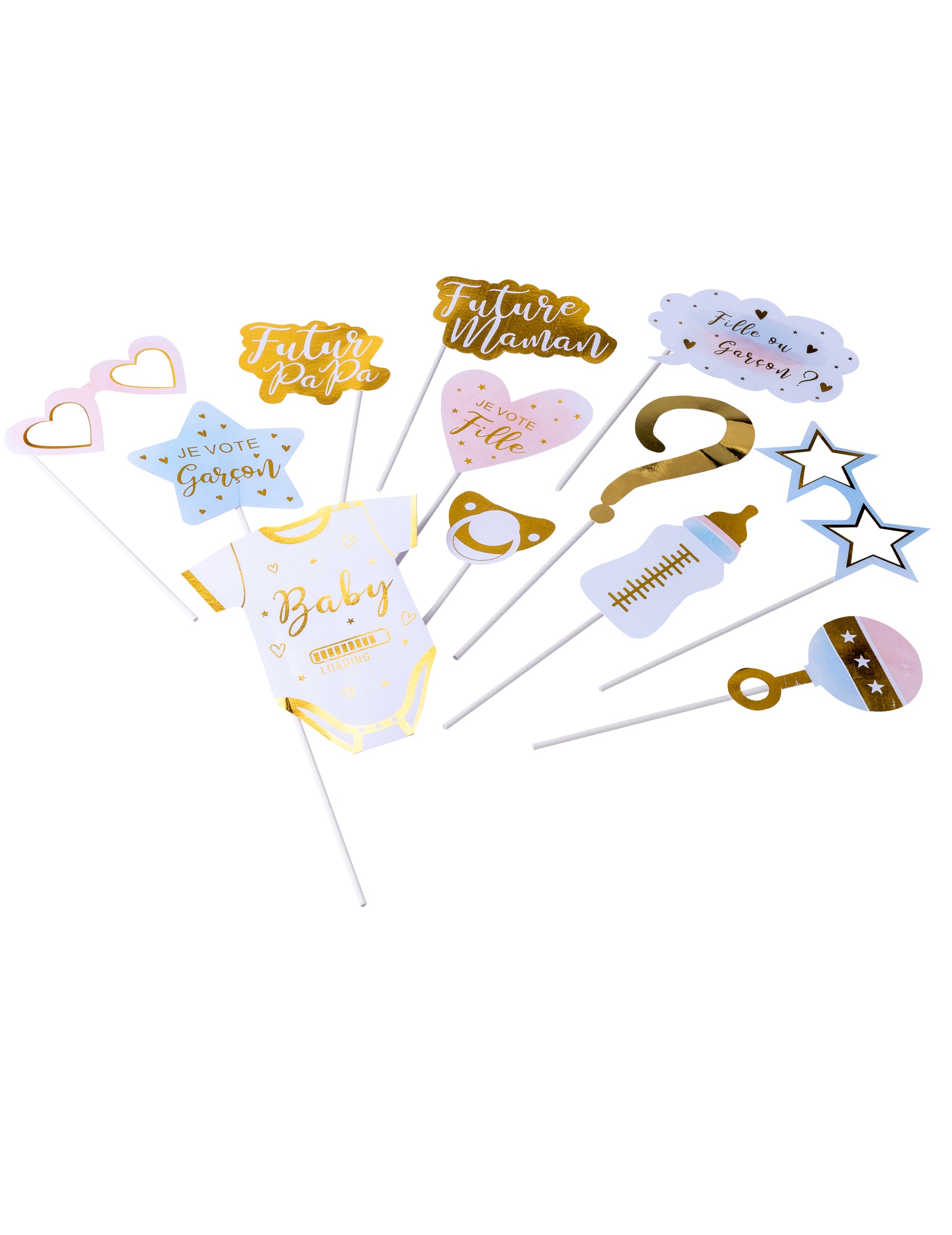 Dívčí nebo chlapecká růžová, modrá a zlatá sada fotobudky 12dílná s odhalením pohlaví