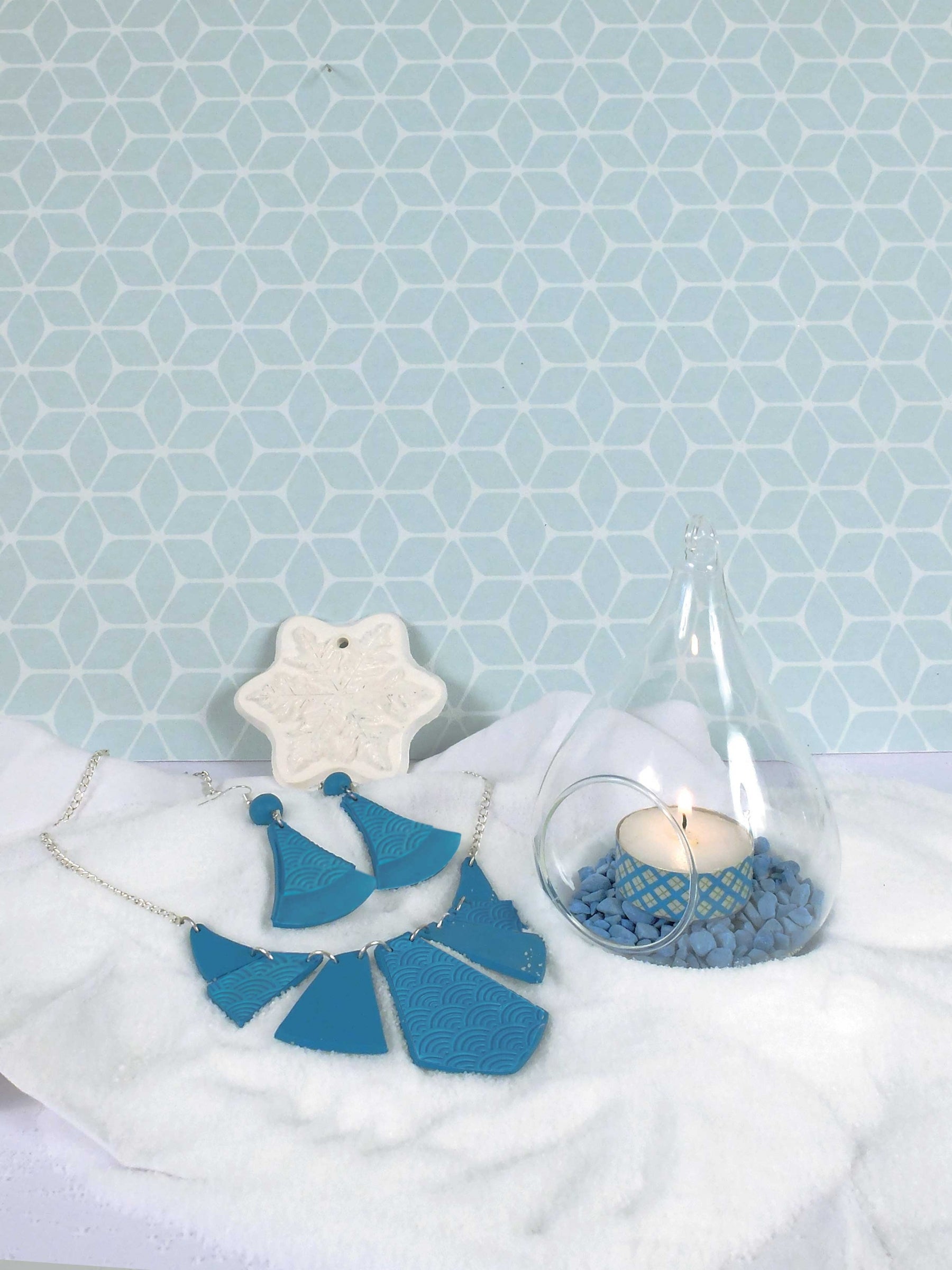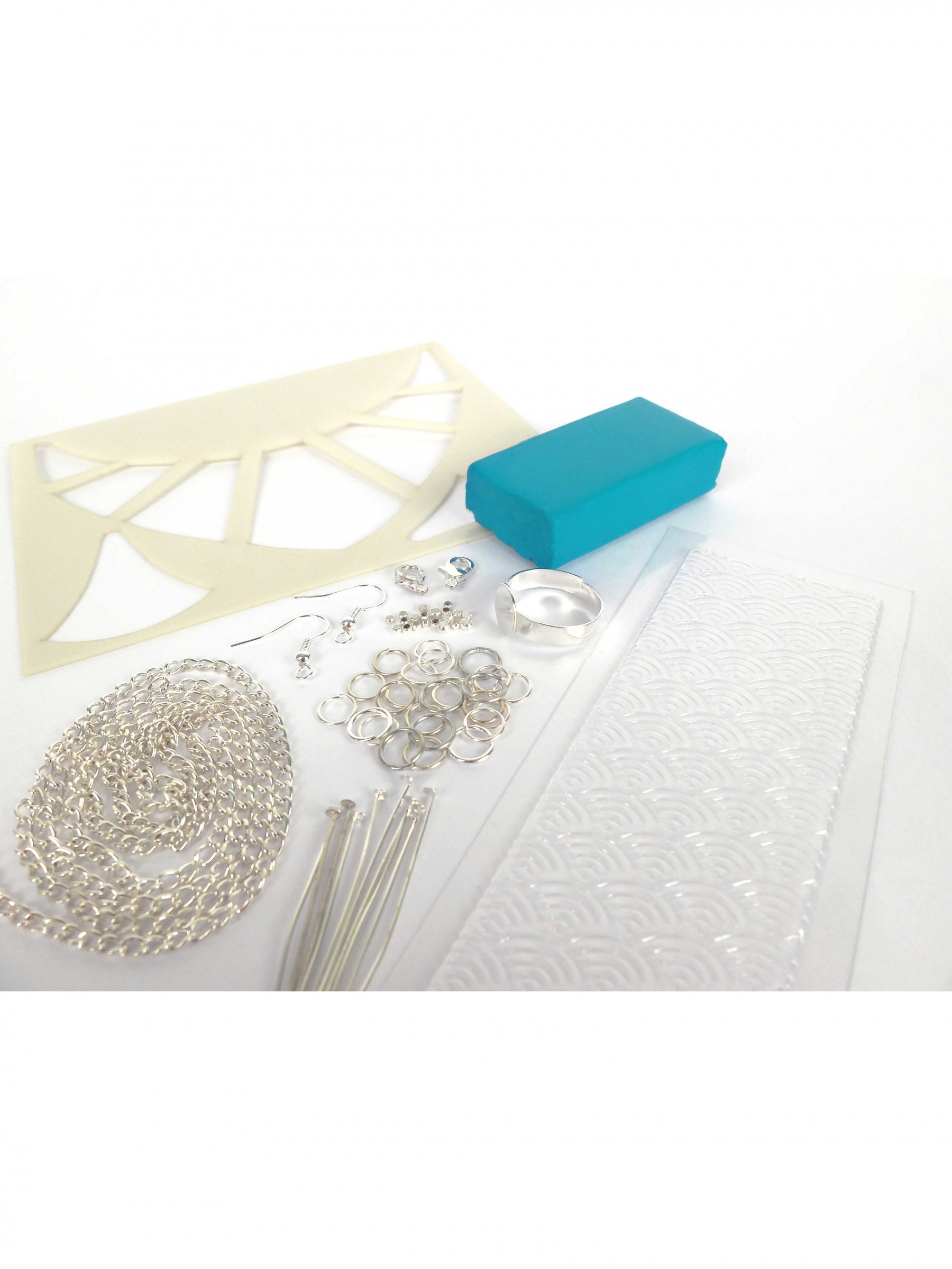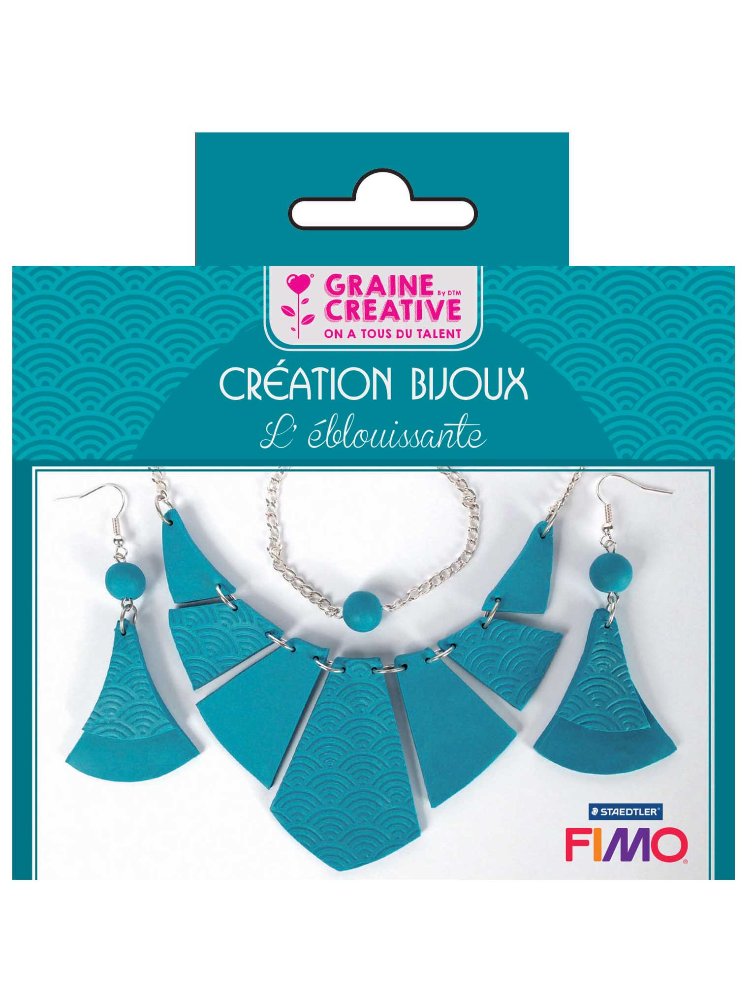 Snadno si navrhněte vlastní sada šperků tyrkysová díky tomu kreativní sada kompletní. Tato krabice obsahuje všechny prvky potřebné pro vaše výtvory: půl bochníku petrolejově modré fimo hlíny, vyřezávací šablonu, texturovací desku a také různé montážní doplňky, jako je metr řetízku, zamačkávací korálky, spojovací hřebíky, spony a kroužky. Tento materiál, doplněný o ilustrovaný návod, vám umožní snadno vyrobit náhrdelník, náramek, prsten a náušnice. Je to perfektní řešení pro začátek tvorba šperků nebo potěšit originálním dárkem k narozeninám.