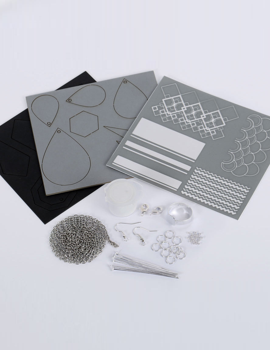 Tato krabička obsahuje vše, co potřebujete: precizní šablonu, výřezy z černé a šedé lepenky, mini dávku bílé barvy, metr řetízku, spojovací cvočky, spony, dělené kroužky, podpěry na náušnice a prsteny a také zamačkávací korálky.
