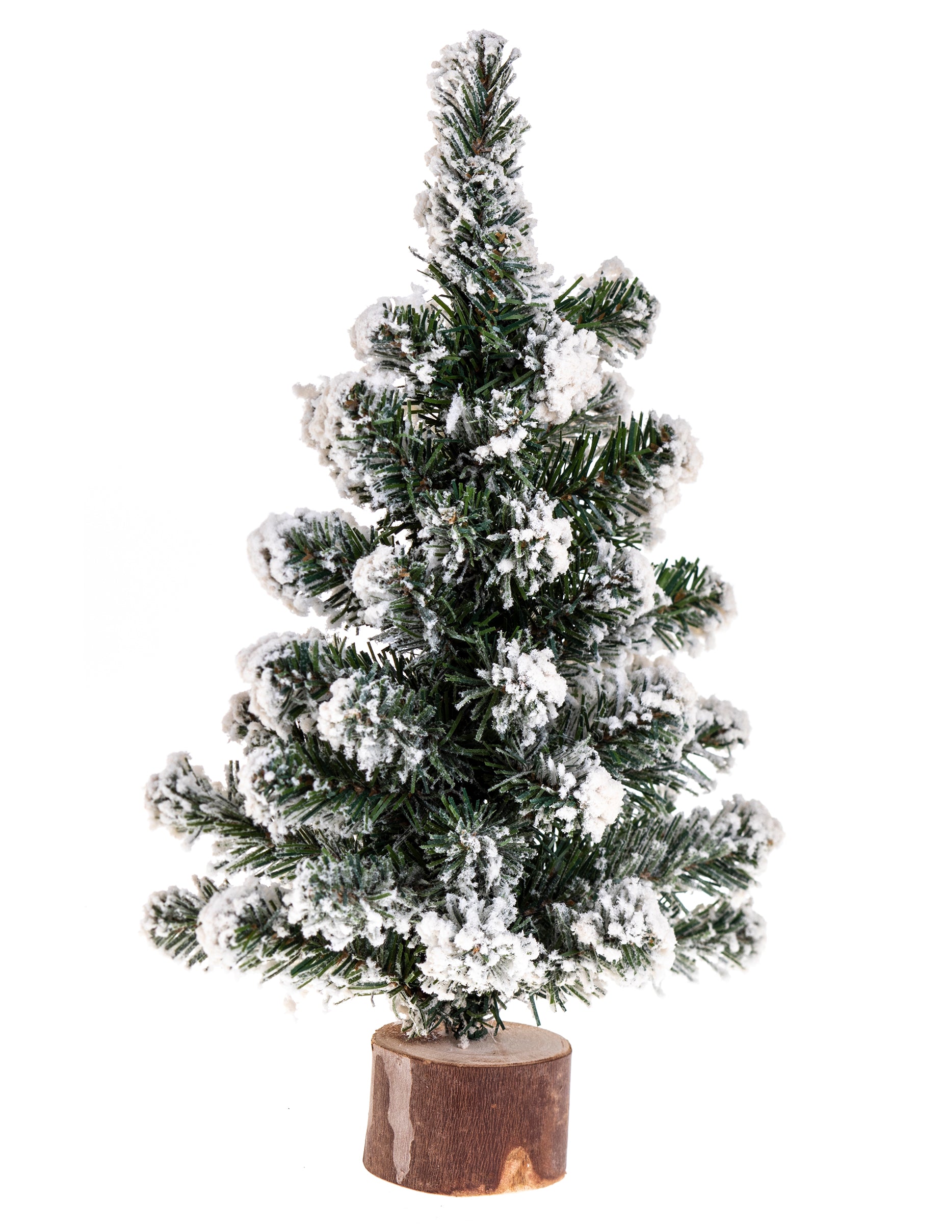 Tento stolní strom měří přibližně 25 cm vysoký. Je zelený s bílými větvemi, které mu dodávají zasněžený efekt. Sedí na dřevěném kmeni. Použijte tento zasněžený strom jako dekoraci stolu na vánoční večeři!